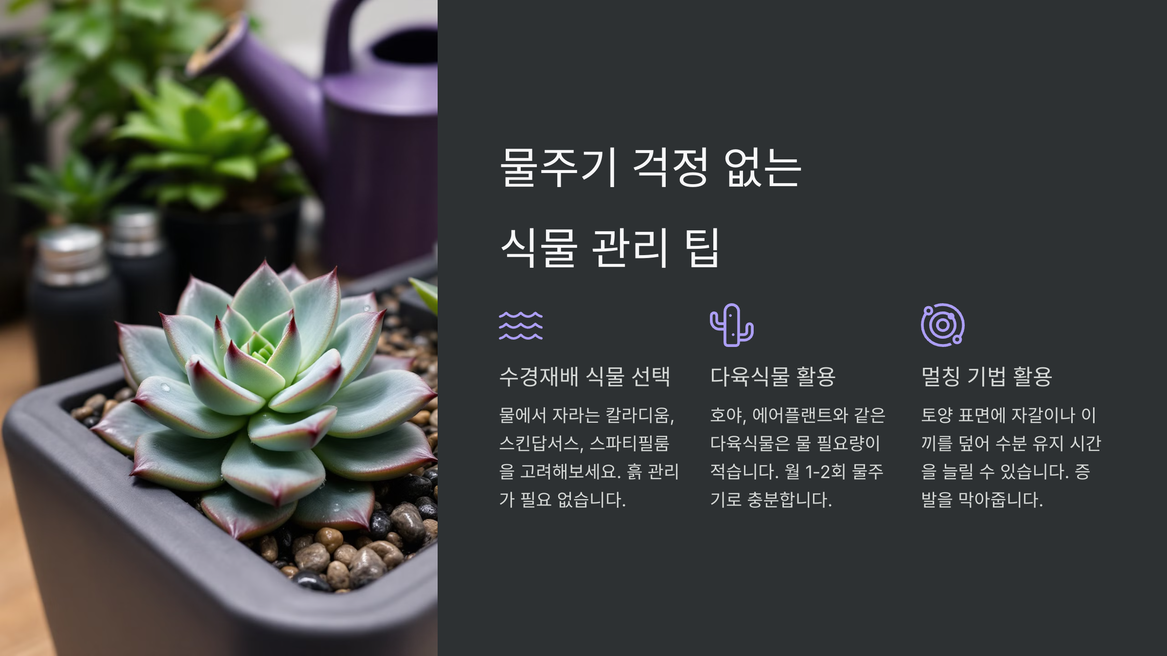 A1. 자동 급수 장치(페트병 점적 관수법, 젤형 급수제 등) 를 활용하면 식물이 스스로 물을 흡수할 수 있어요! 🌿