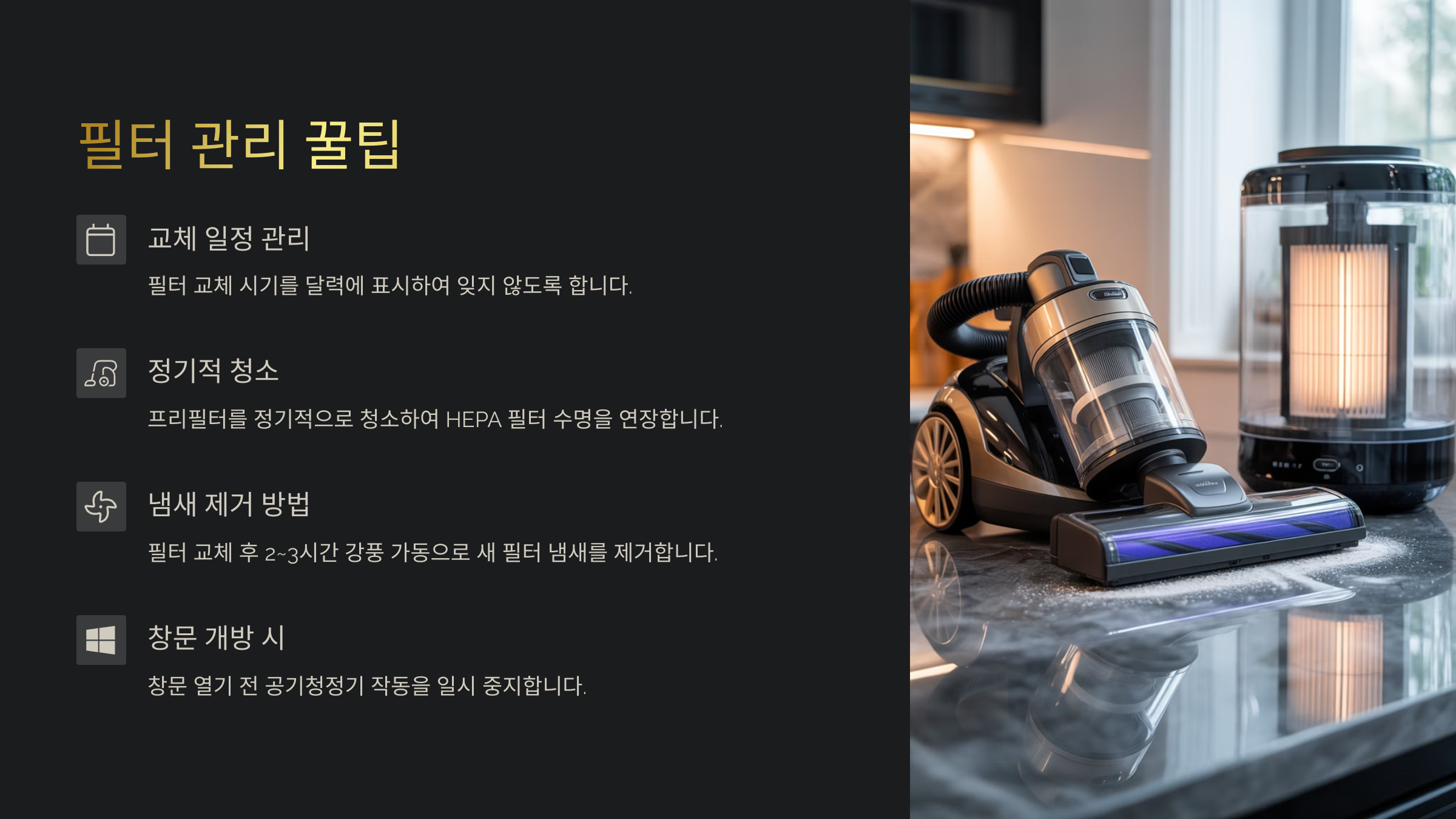 다음으로는 교체한 필터를 오래 사용할 수 있는 관리 팁들을 알려줄게요. 오래 깨끗하게 쓰는 꿀팁! 놓치지 마세요. 😉