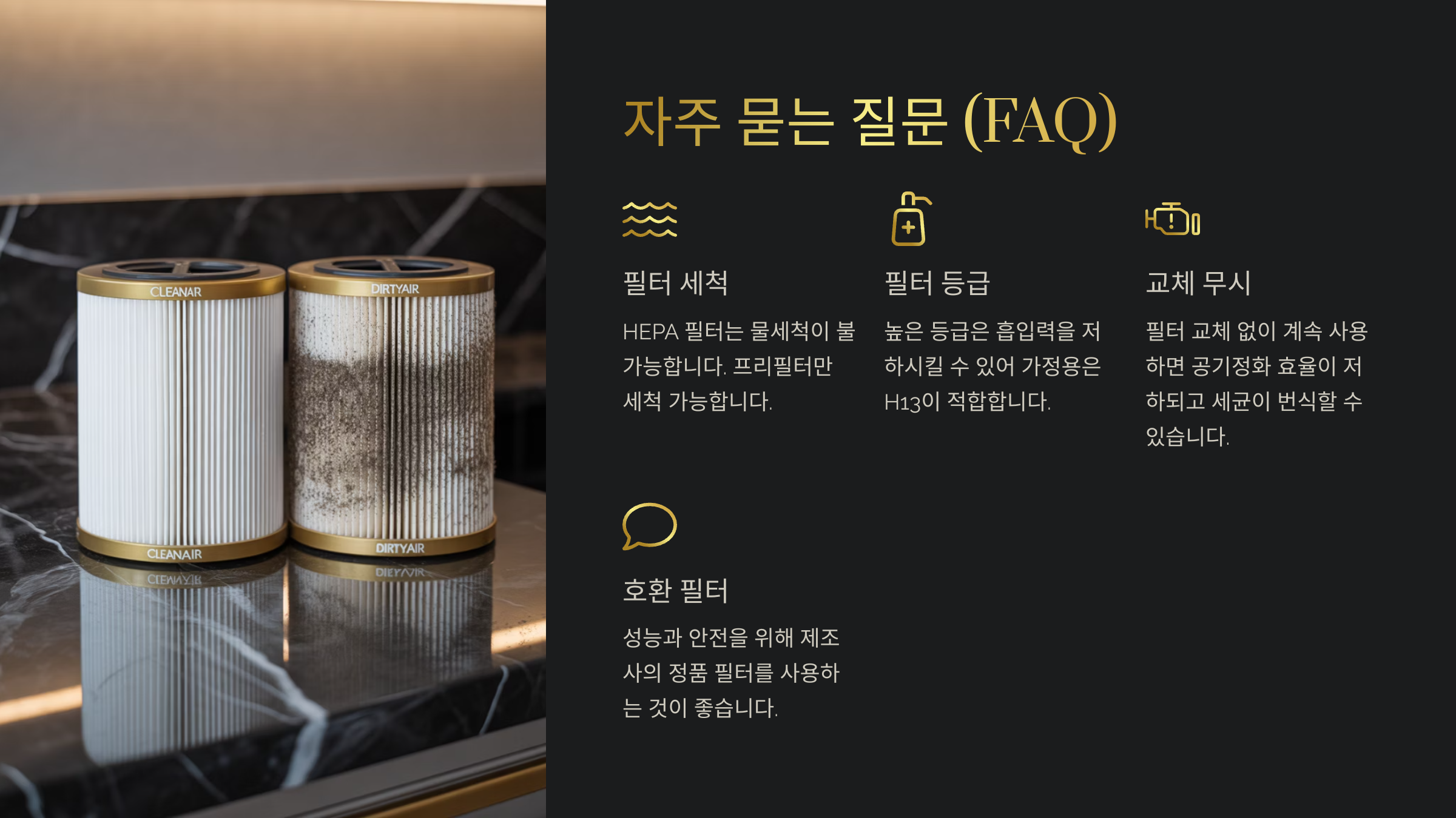 A2. 프리필터는 세척이 가능하지만, HEPA나 탈취 필터는 세척하면 성능이 떨어져요. 대부분 일회용이기 때문에 교체가 필요해요.