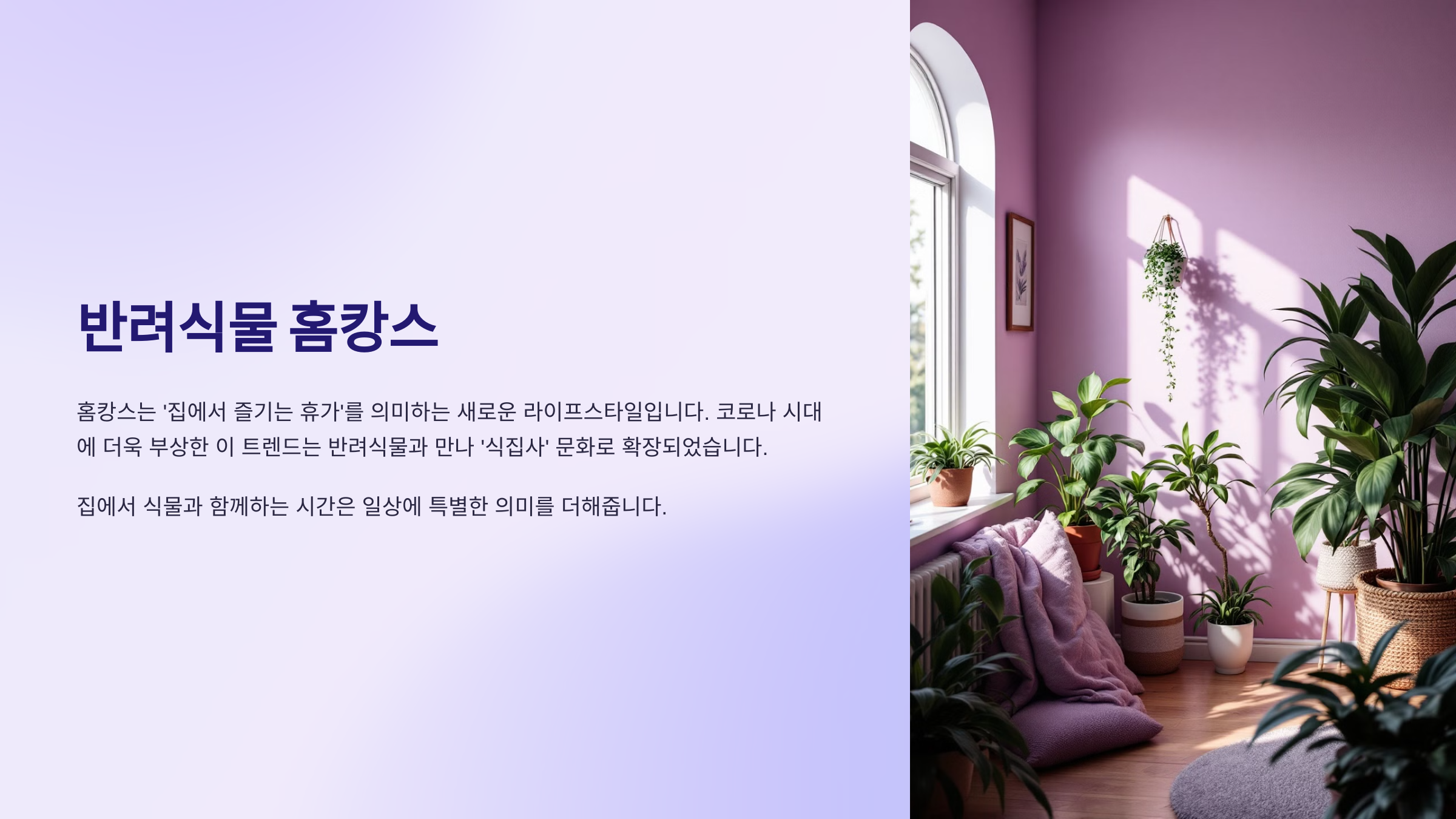 홈캉스는 ‘홈(Home)’과 ‘바캉스(Vacance)’의 합성어로, 집에서 휴가를 즐기는 것을 말해요. 여기에 ‘반려식물’을 더하면, 자연의 품속 같은 공간에서 더 특별한 쉼을 누릴 수 있답니다. 코로나19 이후 사람들은 외출보다 집콕을 택하며 식물과 함께하는 라이프스타일에 관심을 두기 시작했어요.