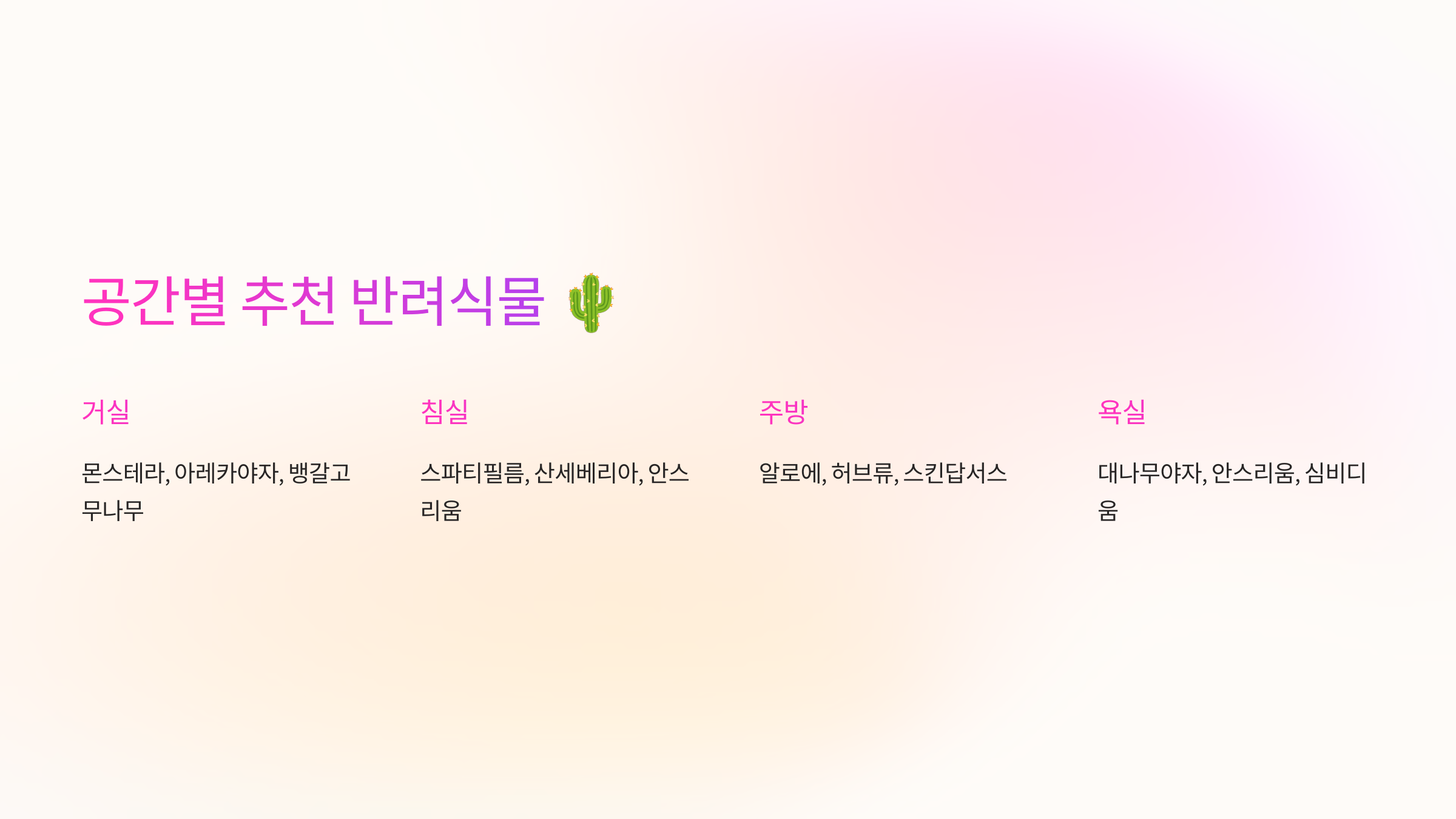 그럼 이제 공간별로 어떤 반려식물이 잘 어울리는지 알아볼까요? 🏡