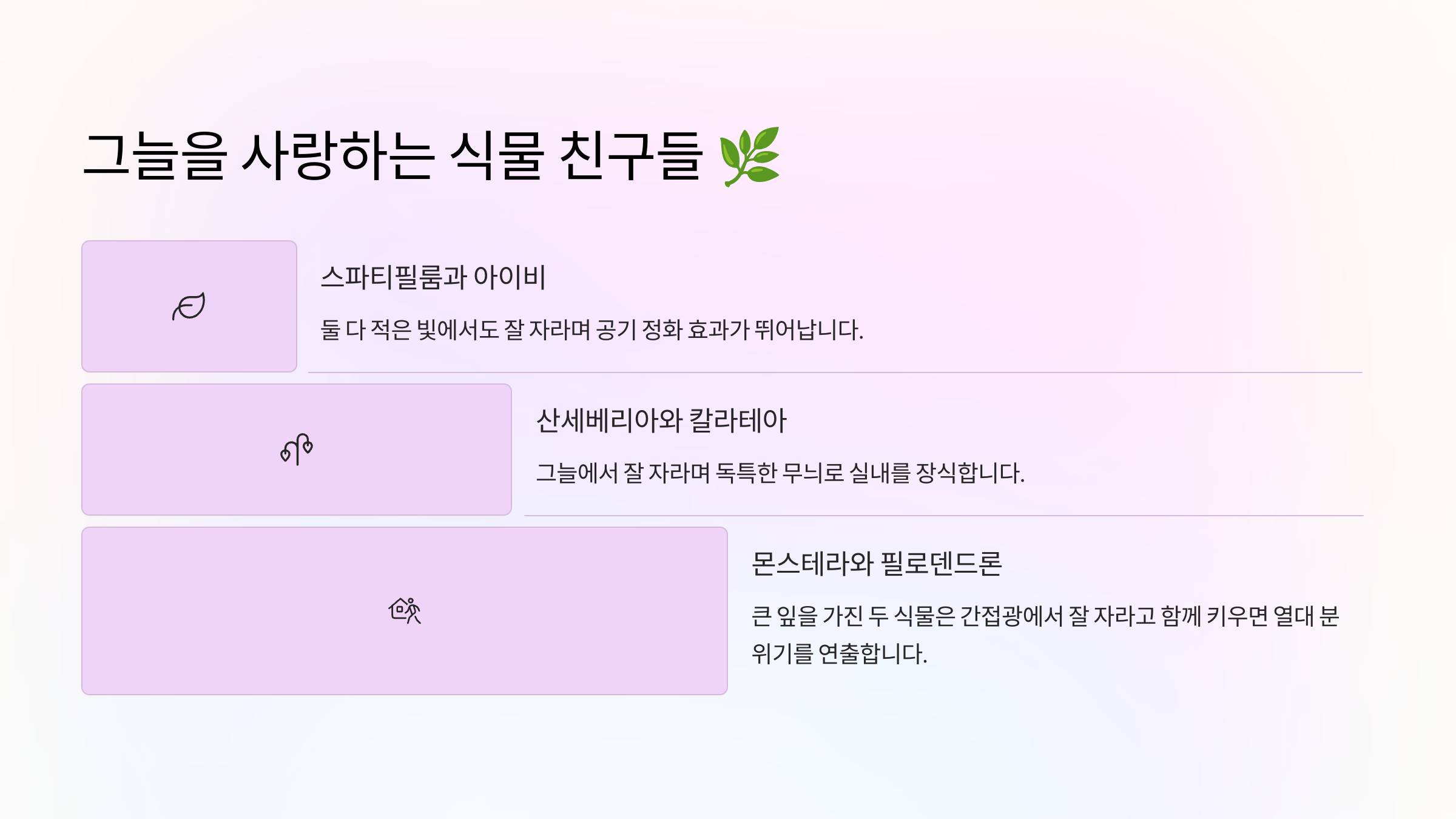 또한 습도를 어느 정도 좋아하기 때문에 욕실 근처나 화장실 창가, 북향 방에 두기 딱 좋아요. 여기에 공기정화 효과까지 겸비한 친구들이라서, 조용히 숨 쉬듯 공간을 깨끗하게 만들어줘요. 빛이 약한 공간일수록 이런 조합이 빛나요.