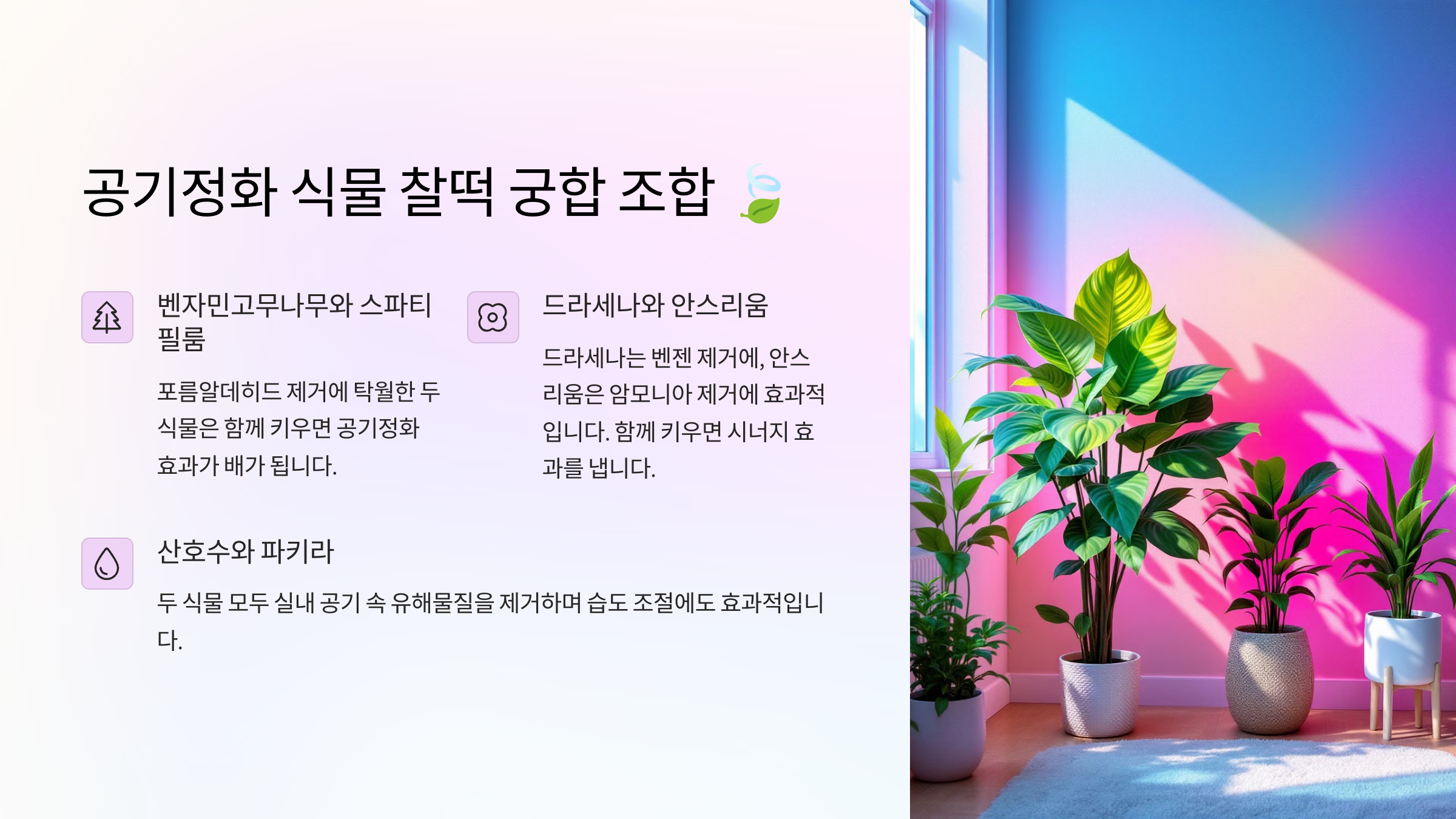 이 식물들을 함께 두면 좋은 이유는 비슷한 생장 조건을 가지기 때문이에요. 물도 자주 주지 않아도 되고, 햇빛이 풍부하면 잎의 성장도 확실히 좋아져요. 여기에 공기정화 능력까지 갖춘 아이들을 더하면 그야말로 ‘빛나는 조합’이 완성돼요!