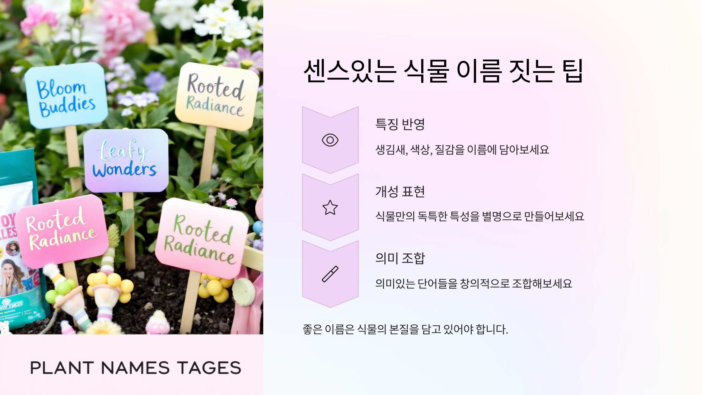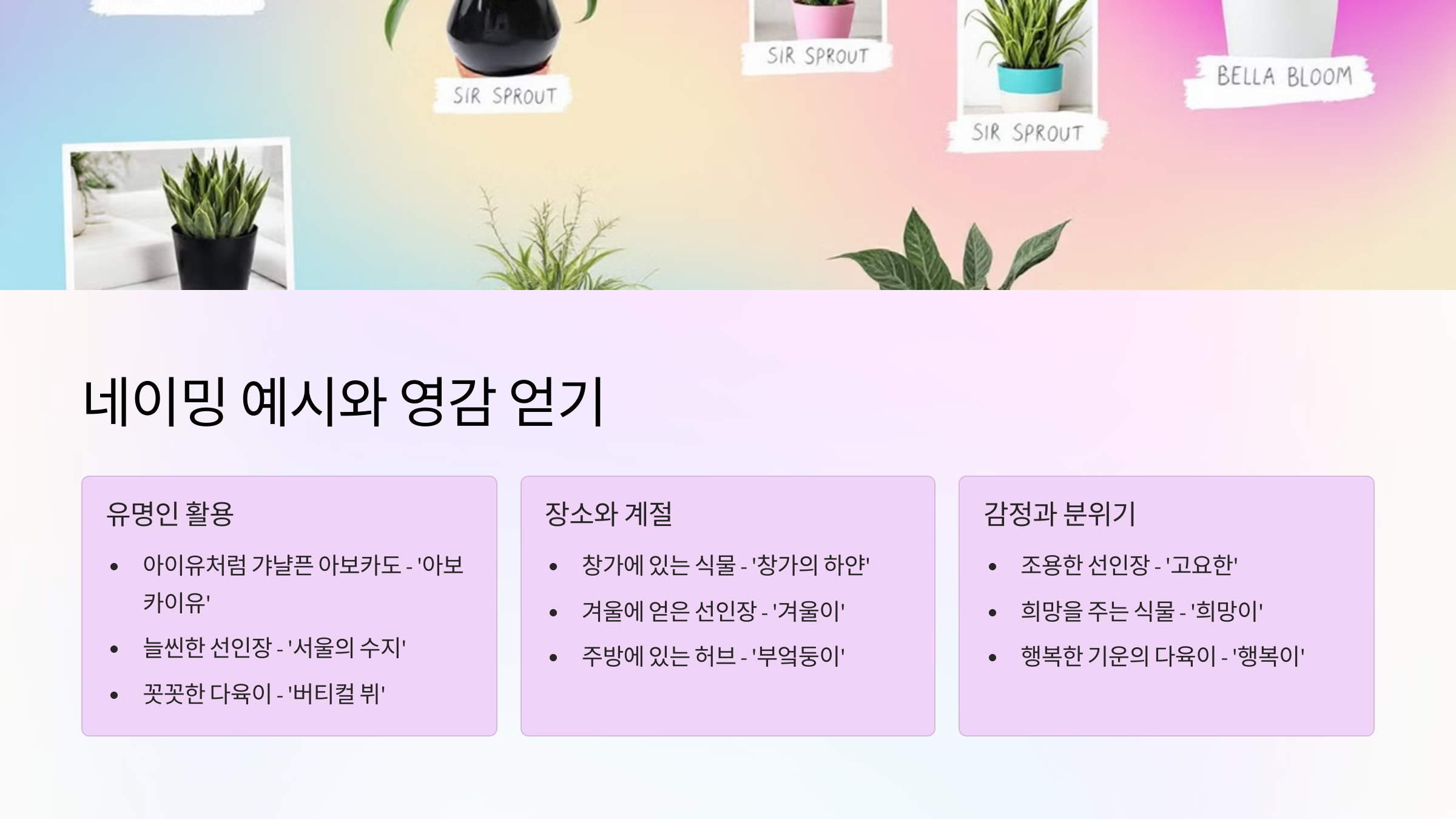 이제 직접 식물 이름을 지어볼 차례예요! 막상 이름을 지으려면 뭐부터 시작해야 할지 막막할 수 있죠. 그래서 여기, 상황별·스타일별로 참고하기 좋은 예시들을 모아봤어요. 이걸 바탕으로 자신만의 유니크한 이름을 만들어보면 좋아요 😊