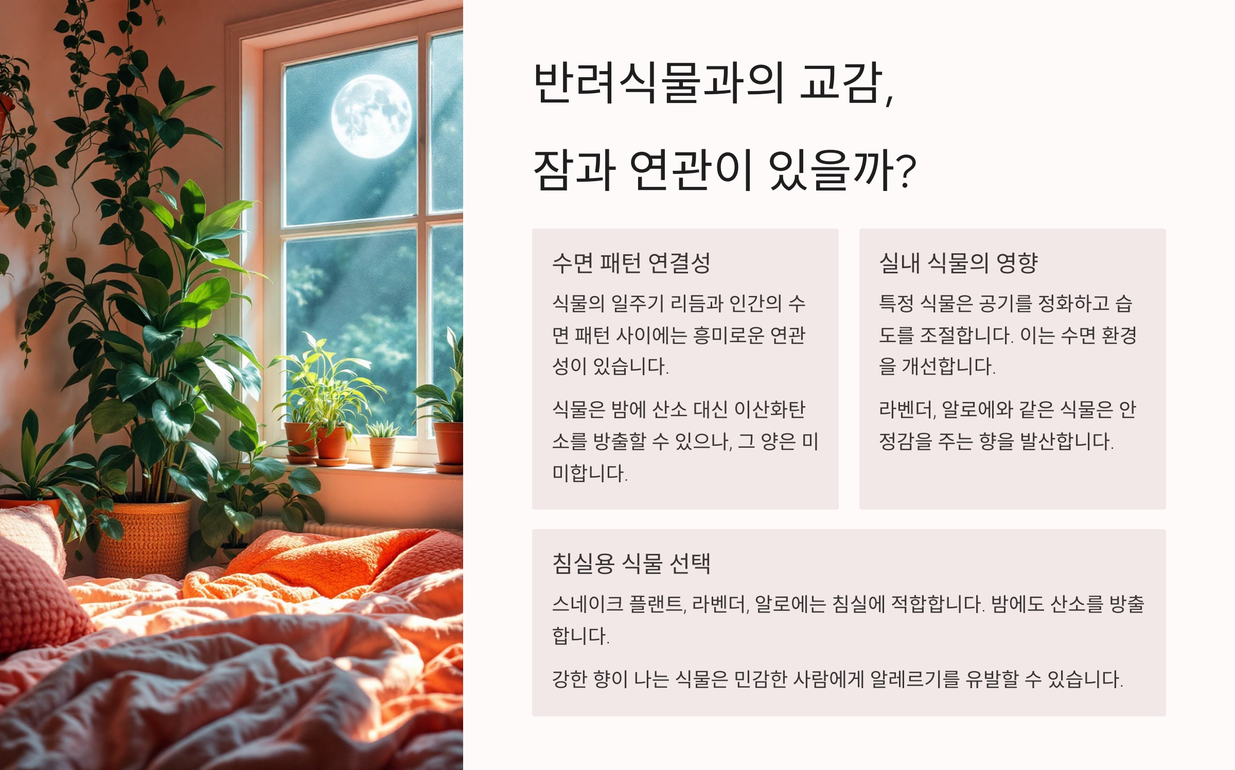 이번엔 식물과 사람 사이, 교감이 잠의 리듬과 어떤 연관이 있을지도 알아볼까요? 다음 섹션 “반려식물과의 교감, 잠과 연관이 있을까?”에서 계속 이어집니다! 🍀