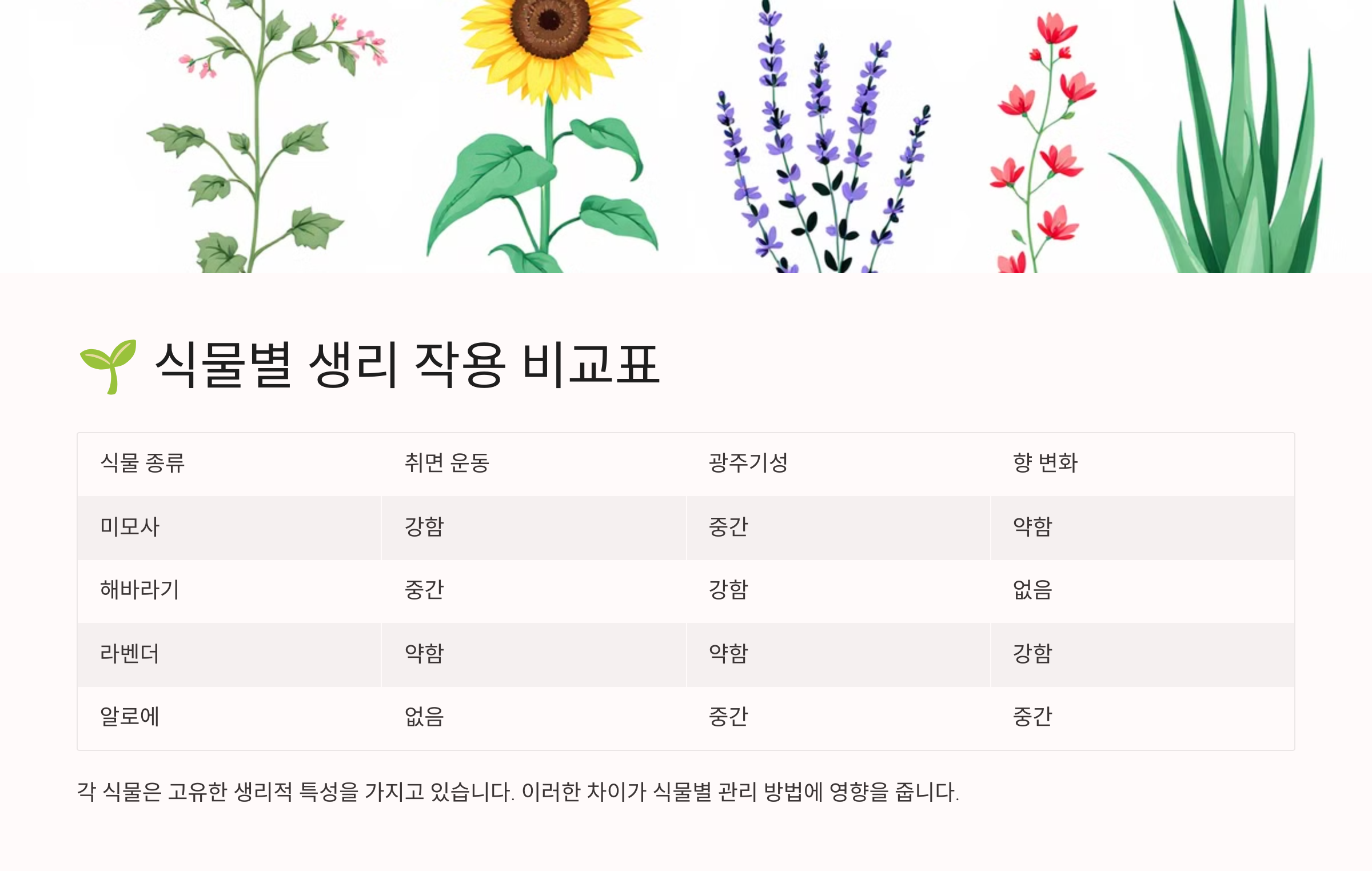 🌱 식물별 생리 작용 비교표