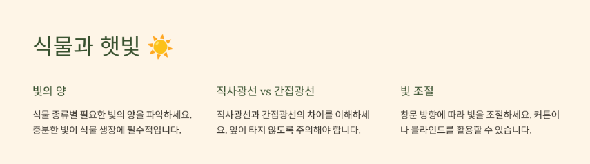햇빛은 식물이 광합성을 통해 에너지를 만들고 성장하는 데 필수적인 요소예요. 하지만 모든 식물이 강한 햇빛을 필요로 하는 건 아니에요. 식물마다 적절한 빛의 강도가 다르답니다. 🌞