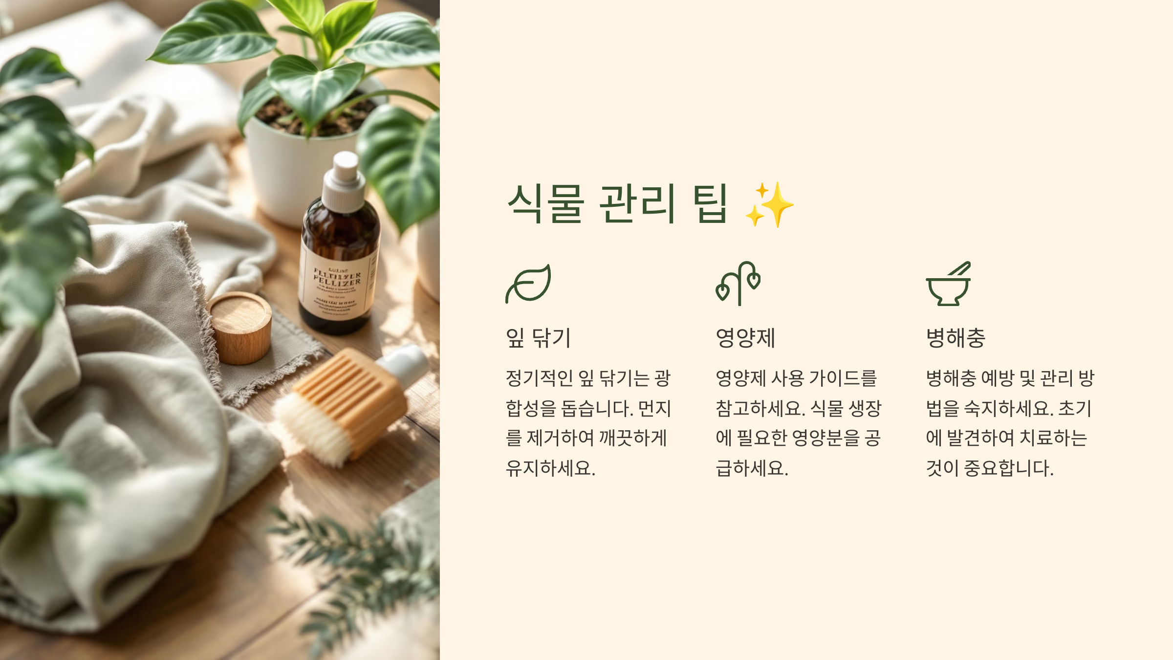 식물을 키울 때는 단순히 물만 주는 것이 아니라, 다양한 요소를 신경 써야 해요. 작은 습관이 식물을 더욱 건강하고 예쁘게 키울 수 있답니다! 🌱