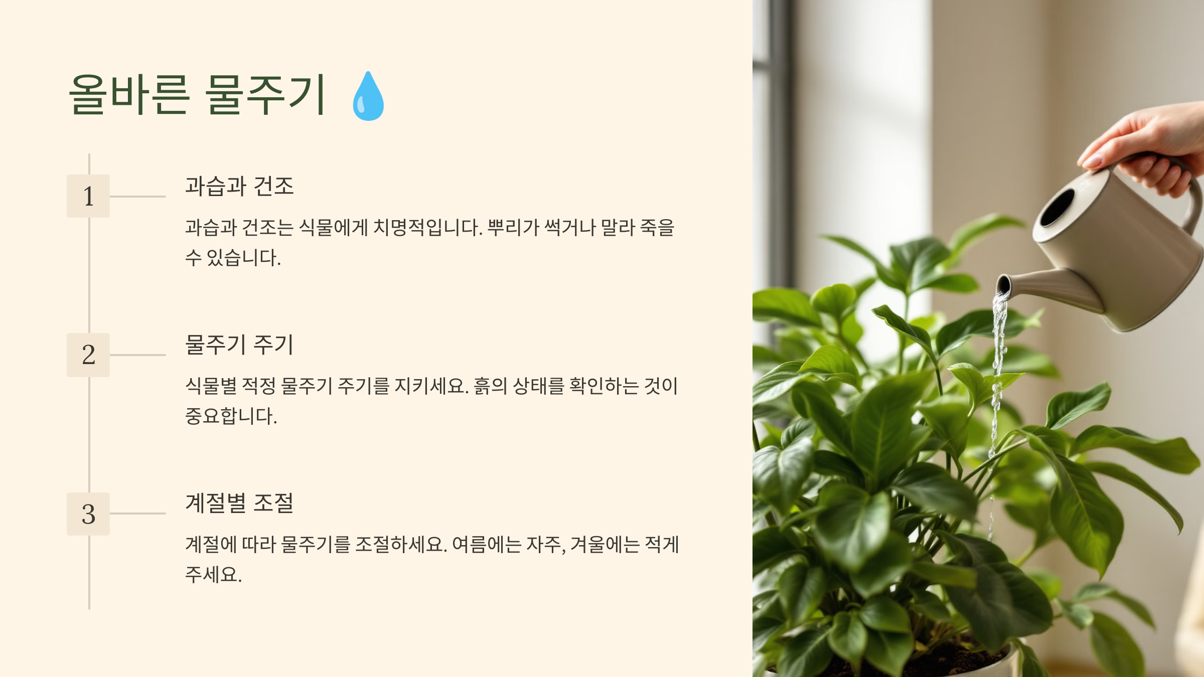 식물을 건강하게 키우려면 적절한 물 주기가 중요해요. 너무 자주 주면 뿌리가 썩고, 너무 적게 주면 식물이 말라버릴 수 있답니다. 💦