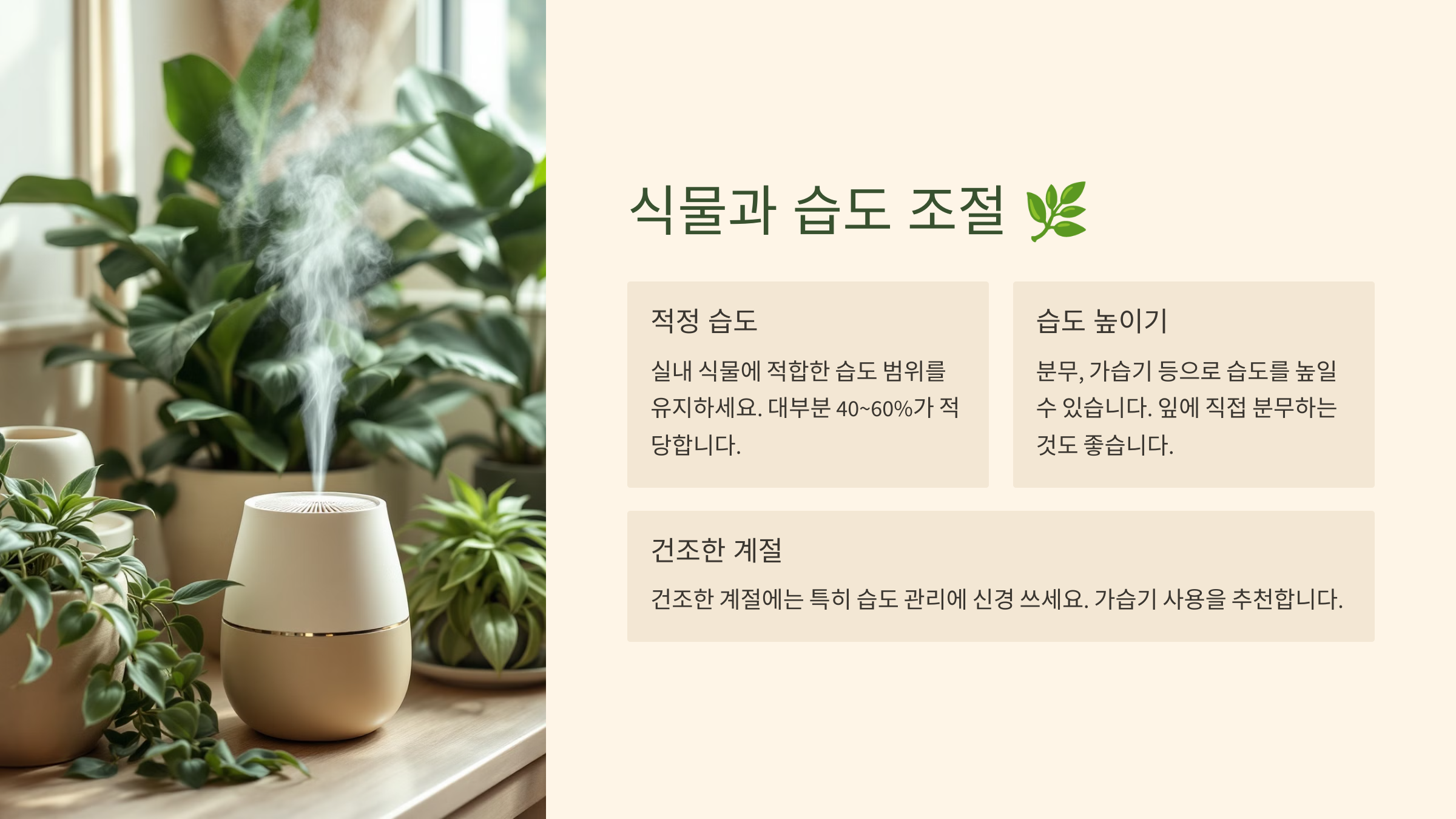 ✅ 습도 조절 방법: 가습기 사용, 식물 주변에 물그릇 놓기, 자갈 트레이 활용, 주기적인 분무 등이 있어요.