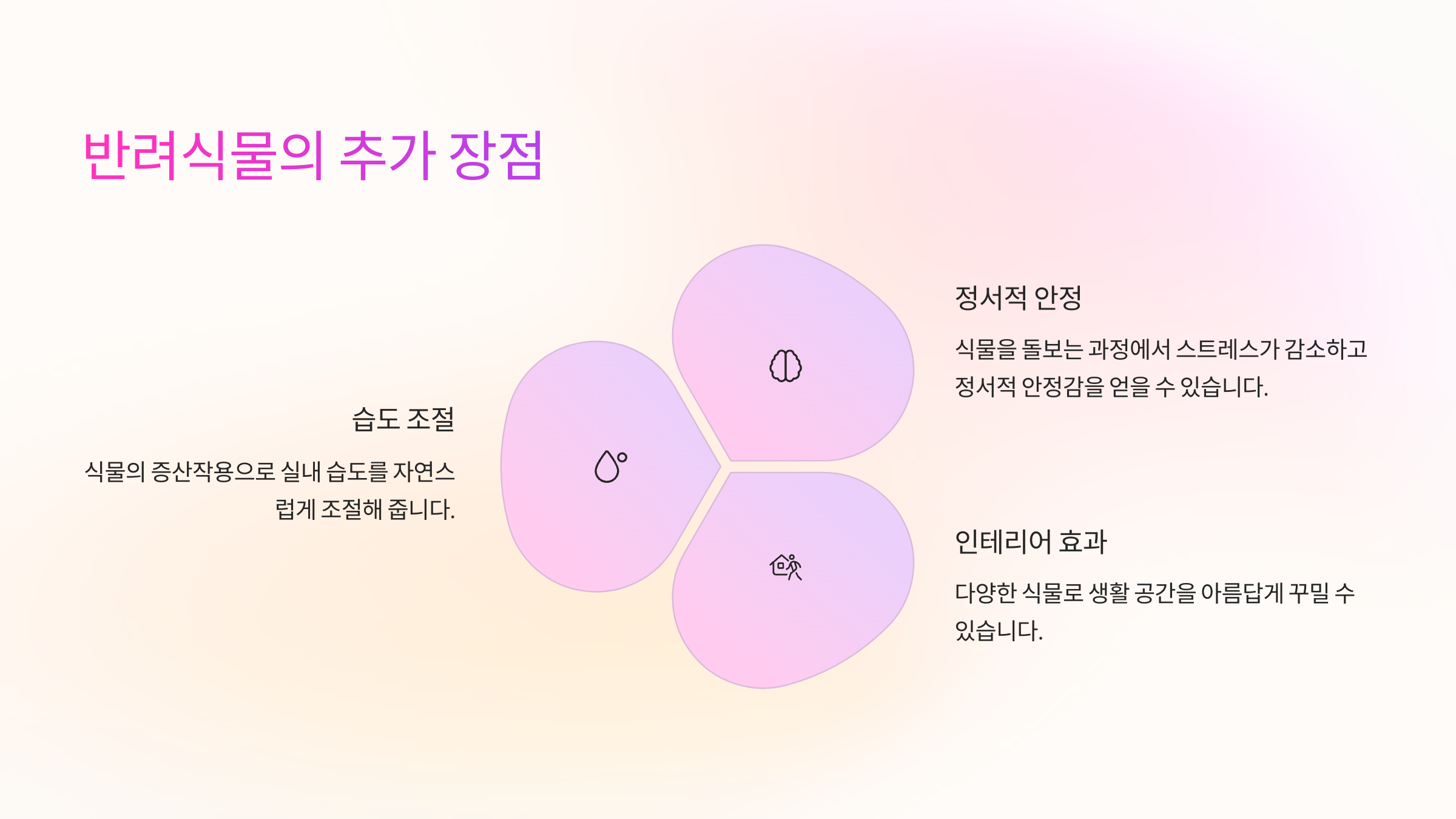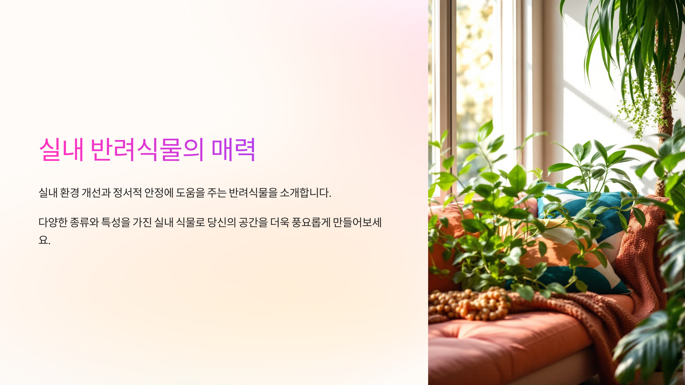 실내 식물은 습도 조절에도 탁월한데요. 특히 겨울철에는 건조함 때문에 피부나 호흡기 문제가 생기기 쉬운데, 식물이 공기 중 수분을 머금어 그런 문제를 줄여줘요. 이처럼 실내 반려식물은 우리 생활 전반에 긍정적인 영향을 끼치는 작은 힐링 메이트랍니다! 🌱