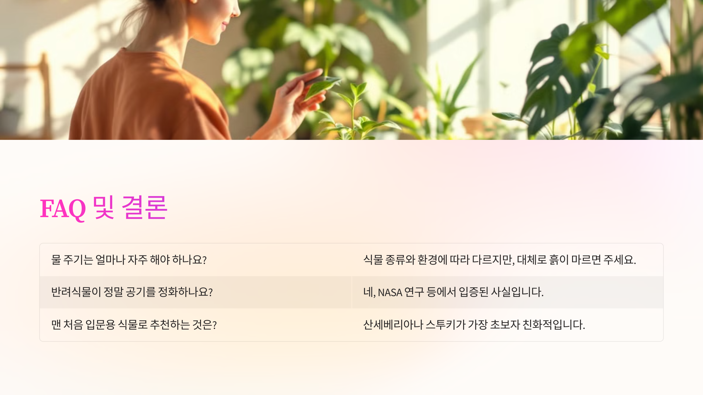 식물 이름 독성 여부 추천 반려동물 특징 키우기 난이도 칼라데아 무독성 고양이, 강아지 잎이 접히는 습성 보통 아레카야자 무독성 강아지 높이 자라며 공기 정화 쉬움 페페로미아 무독성 고양이 작고 귀여운 잎 쉬움 베고니아 마쿨라타 무독성 고양이, 강아지 물방울 무늬 잎 보통 이제 반려동물과 함께하는 공간에서도 식물을 마음껏 즐길 수 있어요! 마지막으로 자주 묻는 실내 식물 관련 질문들을 정리해봤어요. FAQ에서 궁금증을 해결해봐요! 💬