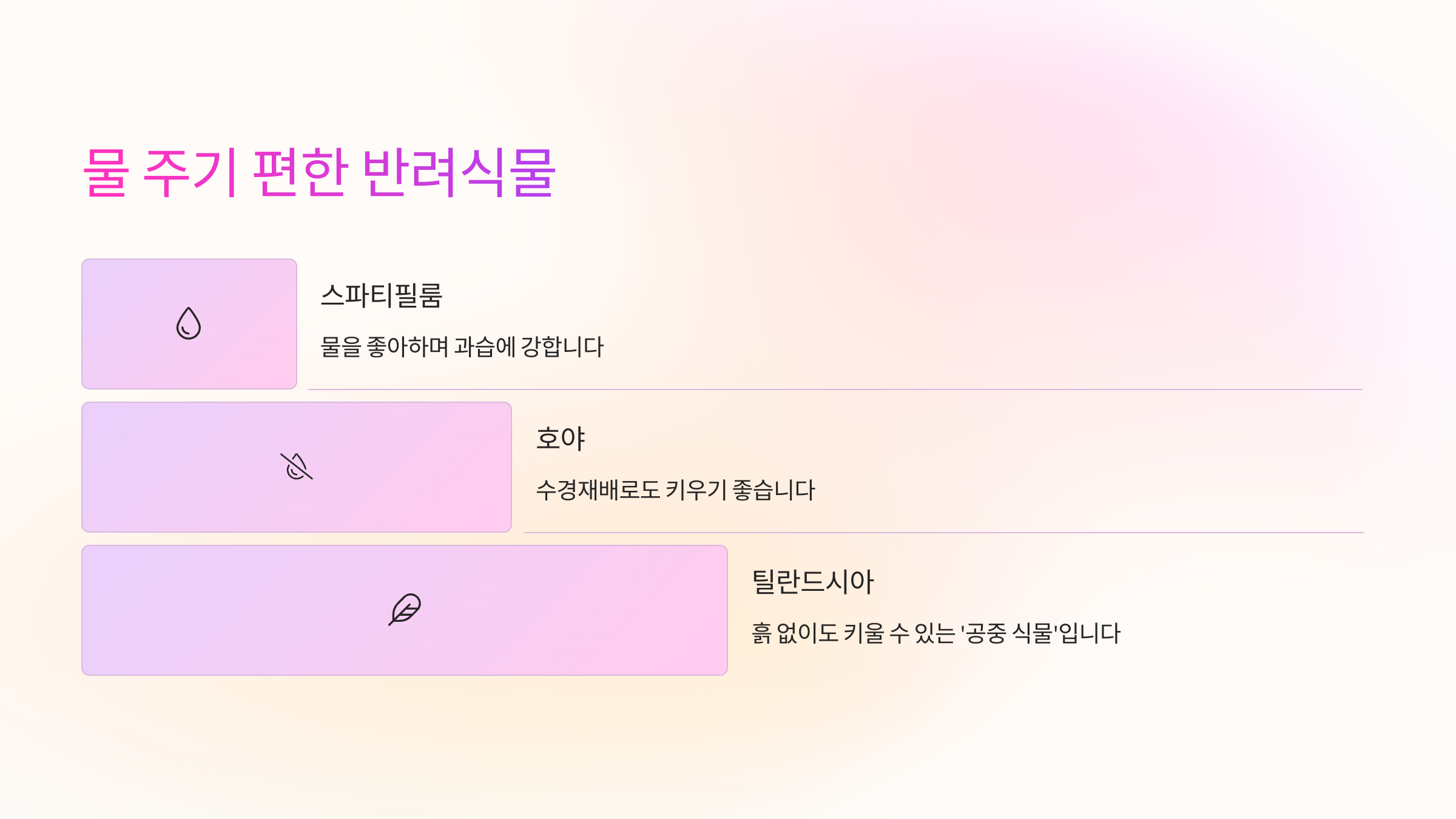 효과 설명 공기 정화 미세먼지와 유해물질 흡수 습도 조절 실내 공기의 적정 습도 유지 스트레스 완화 심리적 안정감 제공 인테리어 효과 공간을 생기 있고 따뜻하게 연출 이렇게 다양한 혜택 덕분에 반려식물은 요즘 같은 시대에 꼭 필요한 존재 같아요. 이제 어떤 식물을 키우면 좋을지 본격적으로 추천 리스트를 알려줄게요! 다음은 공기 정화에 탁월한 식물들이에요 🌬️