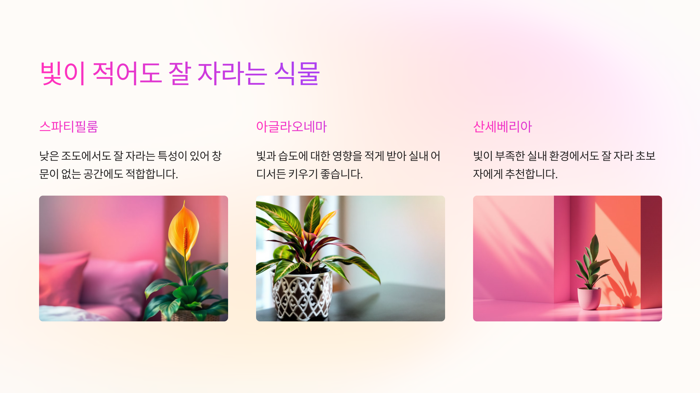 식물 이름 정화 성분 햇빛 물주기 난이도 산세베리아 포름알데히드 제거 반양지 2주 1회 매우 쉬움 스파티필름 벤젠, 톨루엔 제거 간접광 주 1회 쉬움 고무나무 암모니아, 포름알데히드 밝은 간접광 5~7일 1회 보통 드라세나 자일렌, 포름알데히드 반음지 주 1~2회 보통 공기 정화 식물은 일상 속 숨 쉬는 공간을 건강하게 바꾸는 데 정말 큰 역할을 해요. 이제 빛이 부족한 환경에서도 잘 자라는 식물들을 살펴볼게요! 💡