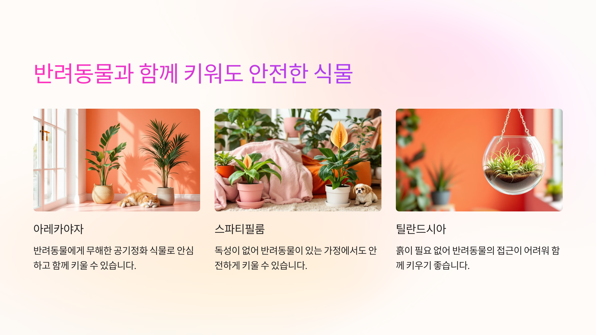 식물을 키울 때 걱정되는 게 하나 있다면 바로 반려동물과의 공존이에요. 강아지나 고양이가 식물을 물어뜯거나 먹었을 때, 독성이 있다면 건강에 치명적일 수 있거든요. 그래서 식물 선택 시 꼭 ‘무독성 식물’인지 확인하는 게 좋아요.
