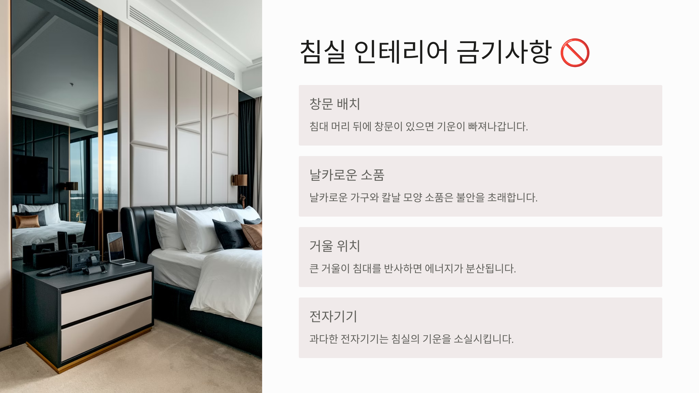 아무리 예쁘고 감성적인 인테리어라도 풍수적으로 좋지 않은 요소들이 있어요. 이런 요소들은 오히려 기운을 막거나, 나쁜 기운을 끌어올 수 있으니 조심해야 해요. 특히 침실은 ‘정적인 공간’이기 때문에 동적인 요소는 최대한 줄여야 한답니다.