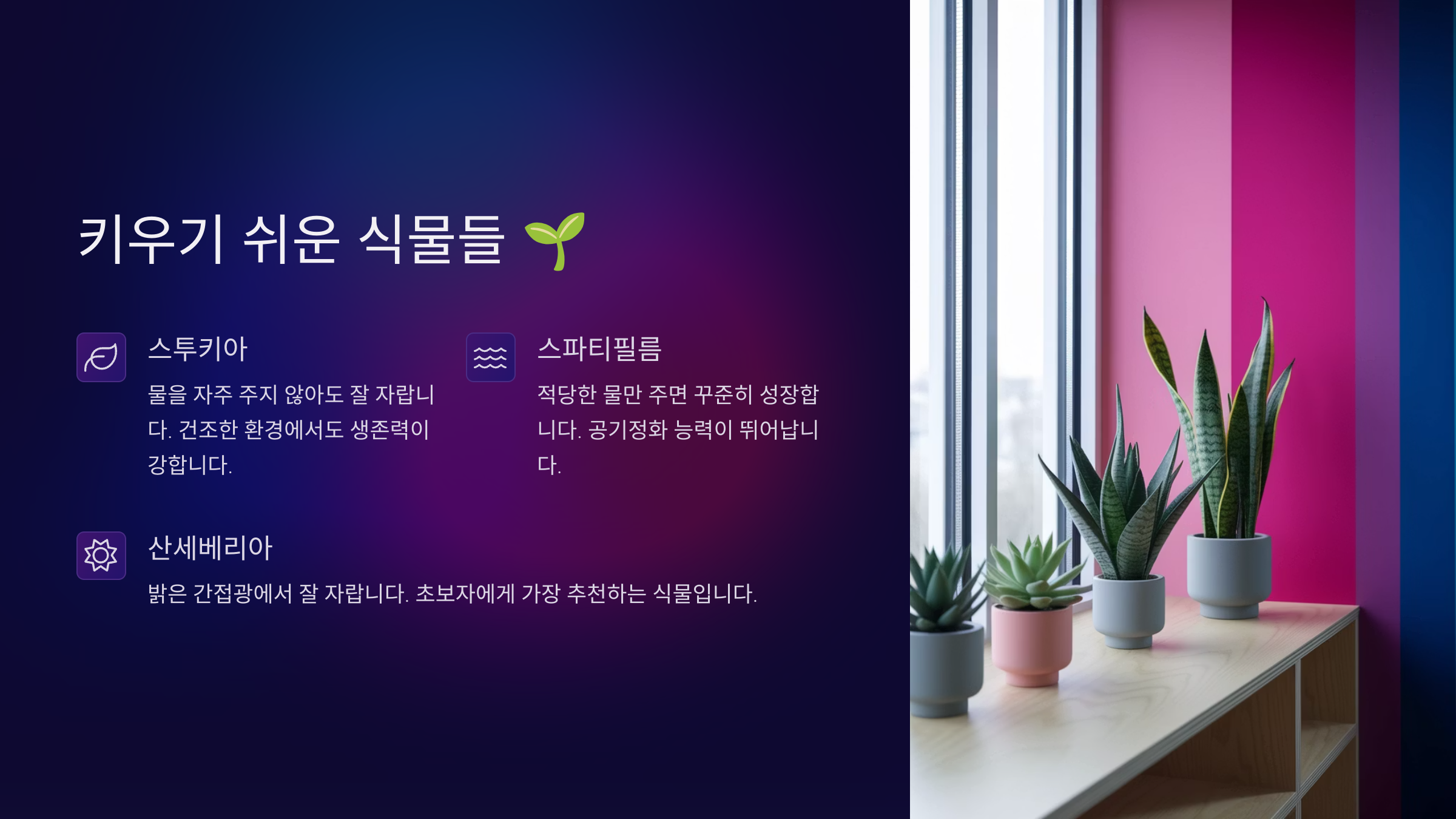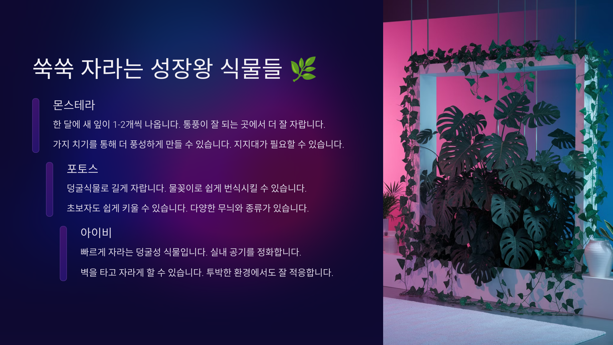 이런 식물들은 공간을 풍성하게 만들어주고, 생장 속도가 빨라서 키우는 즐거움을 두 배로 느낄 수 있어요! 🌿