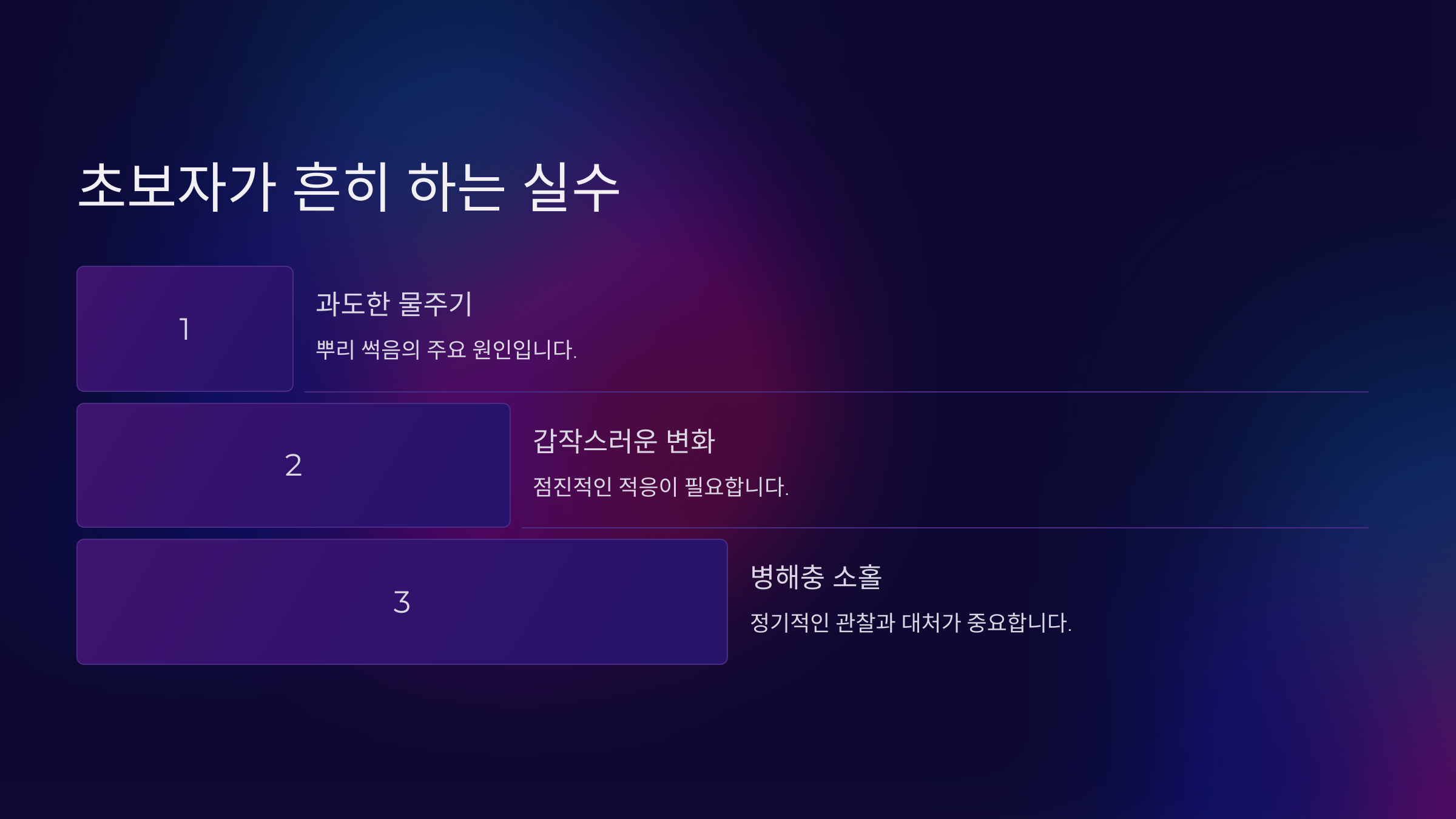 하지만 초보자들이 반려식물을 키울 때 흔히 하는 실수도 있어요. 다음으로 알아볼까요? ⚠