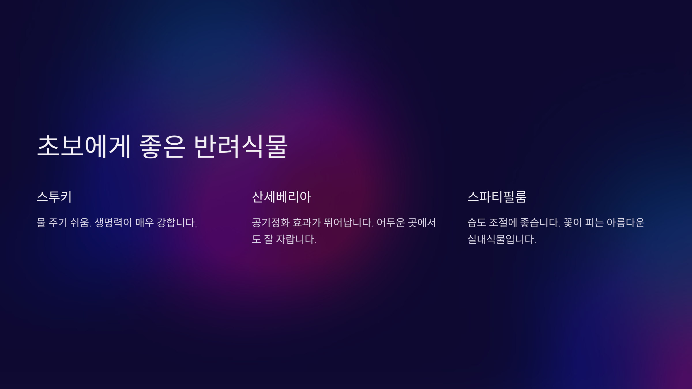 식물명 특징 관리 난이도 스투키 공기 정화 효과가 뛰어나고, 물을 적게 줘도 됨 매우 쉬움 몬스테라 큰 잎이 멋진 분위기를 연출, 반그늘에서도 잘 자람 쉬움 산세베리아 실내 공기 정화 기능이 뛰어나며, 키우기 매우 간단 매우 쉬움 필로덴드론 습도에 강하고, 햇빛이 부족한 곳에서도 생존 가능 쉬움 위 식물들은 공기 정화 효과도 뛰어나고, 실내에서도 잘 자라기 때문에 처음 반려식물을 키우는 분들에게 딱이에요! 🏡💚