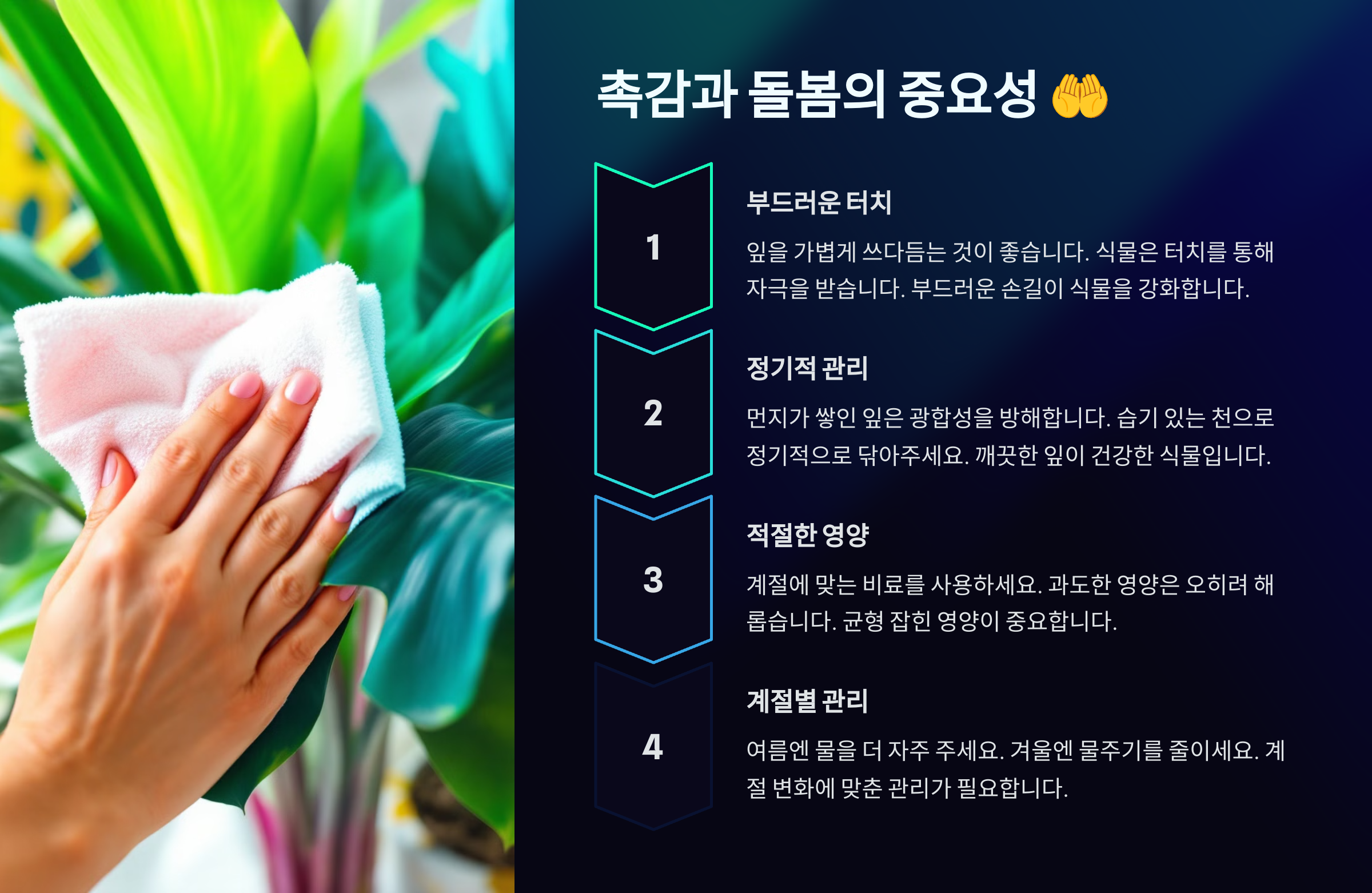 A4. 적당한 촉감은 줄기를 튼튼하게 하지만, 너무 자주 만지면 스트레스를 받을 수 있어요. 하루 한두 번 가볍게 쓰다듬는 정도가 좋아요. 🤲