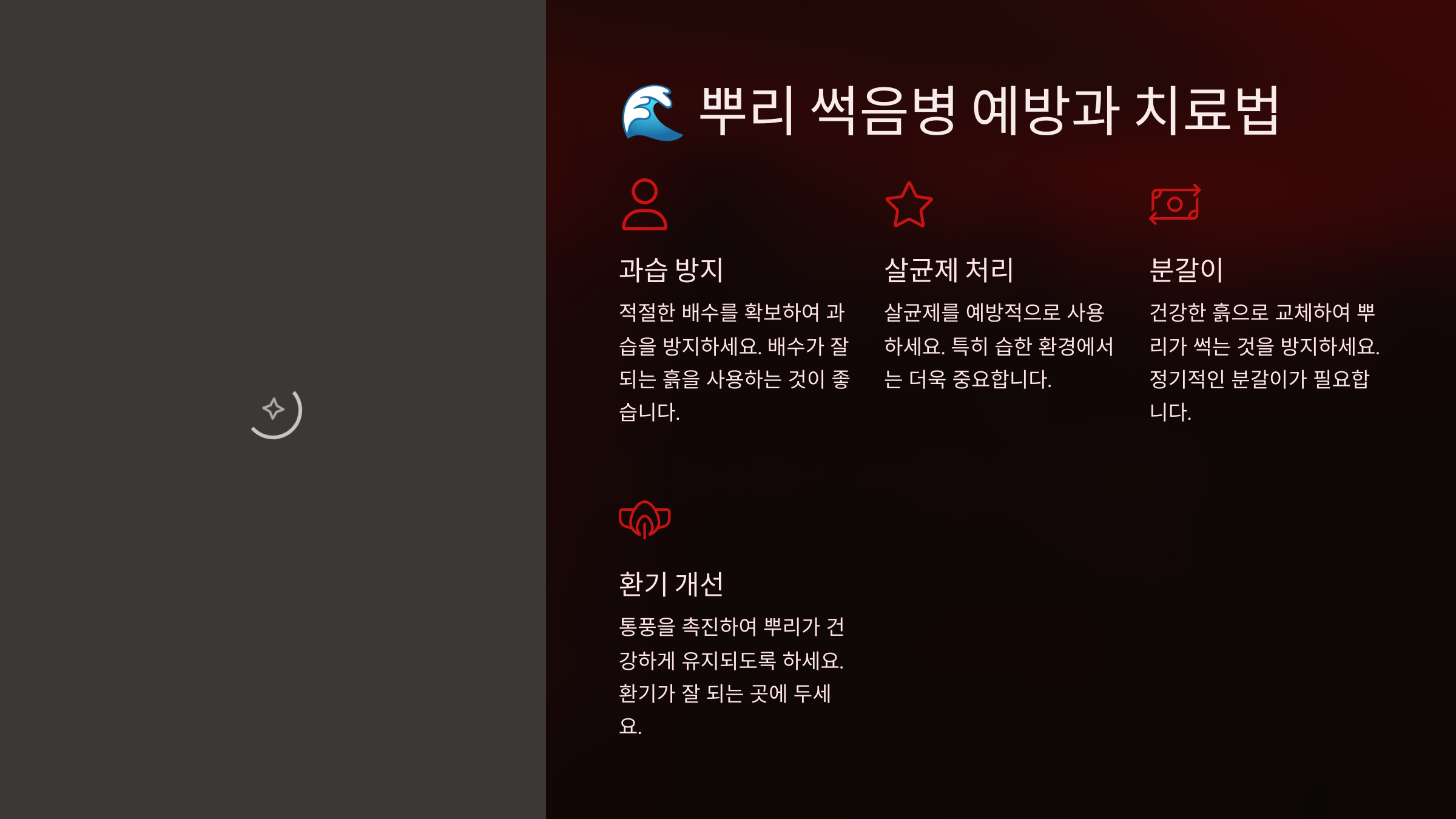 뿌리 썩음병을 예방하려면 배수에 신경 써야 해요. 물 빠짐이 좋은 흙을 사용하고, 화분 바닥에 배수 구멍이 충분히 있는지 확인하세요. 또한, 물을 줄 때는 흙이 완전히 마른 후에 주는 것이 중요해요. 💦