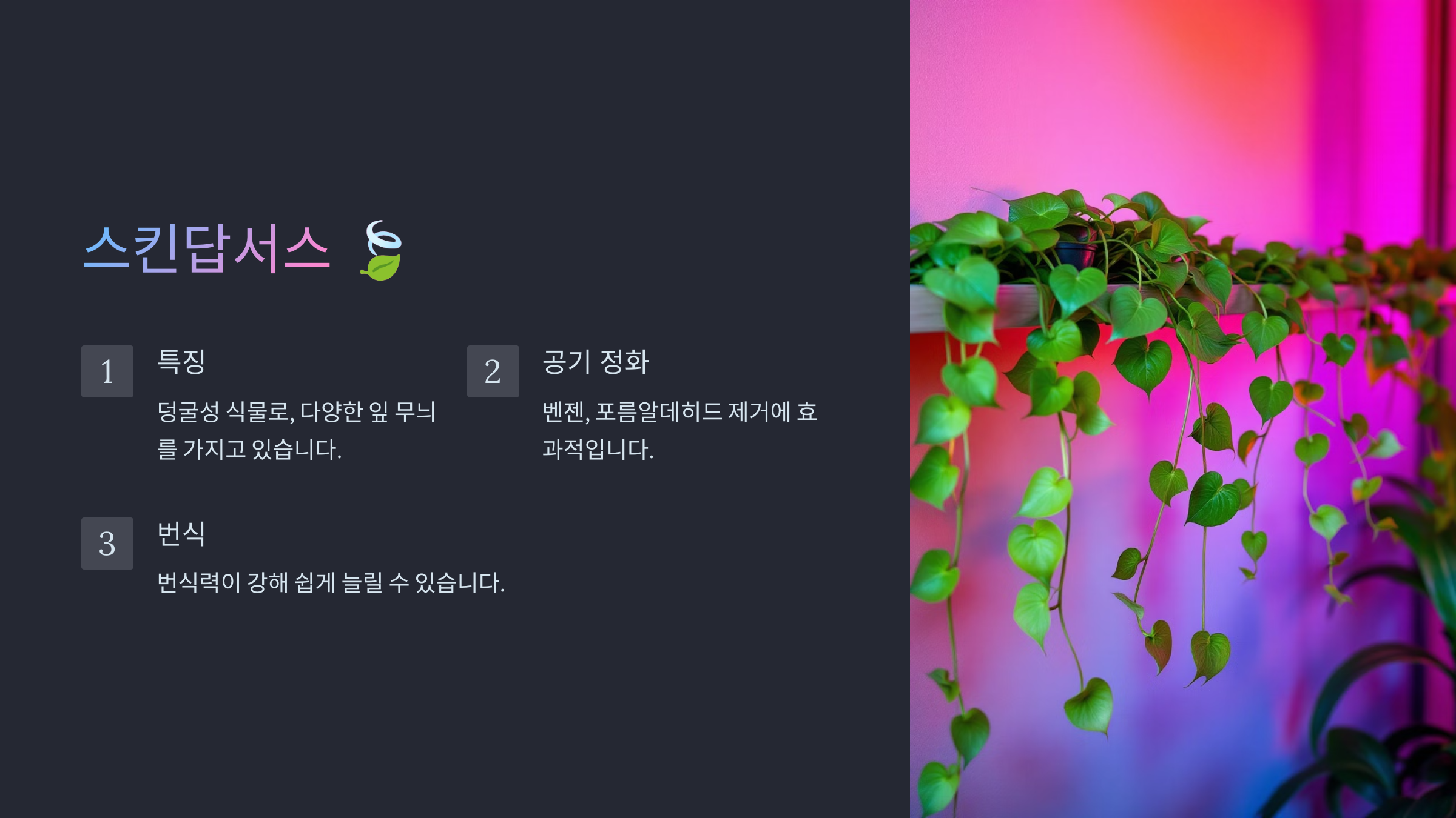 스킨답서스는 덩굴 식물로, 어두운 공간에서도 생명력이 강한 식물이에요. 천장이나 높은 선반에서 아래로 늘어뜨려 키우면 인테리어 효과도 뛰어나죠! 🌿특징: