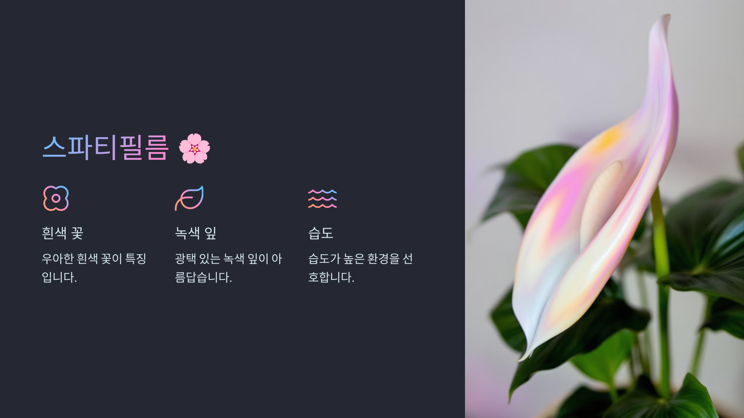 스파티필름은 어두운 곳에서도 꽃을 피우는 식물이에요! 공기 중 유해물질을 제거하는 능력이 뛰어나서 공기 정화 식물로도 인기가 많죠. 🌿