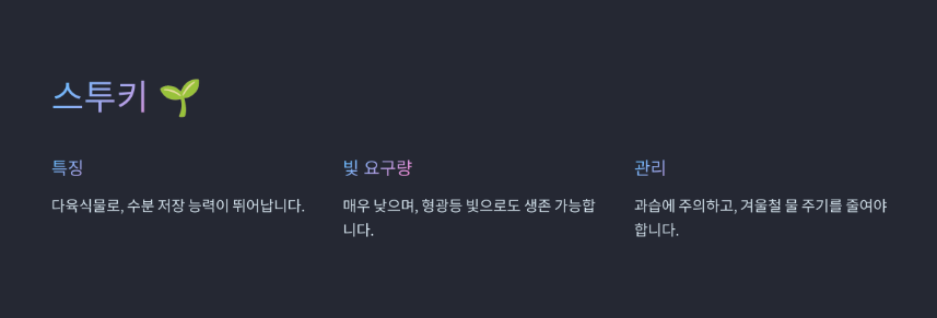 - ✔ 약한 빛에서도 잘 자라며, 물도 많이 필요하지 않아요.