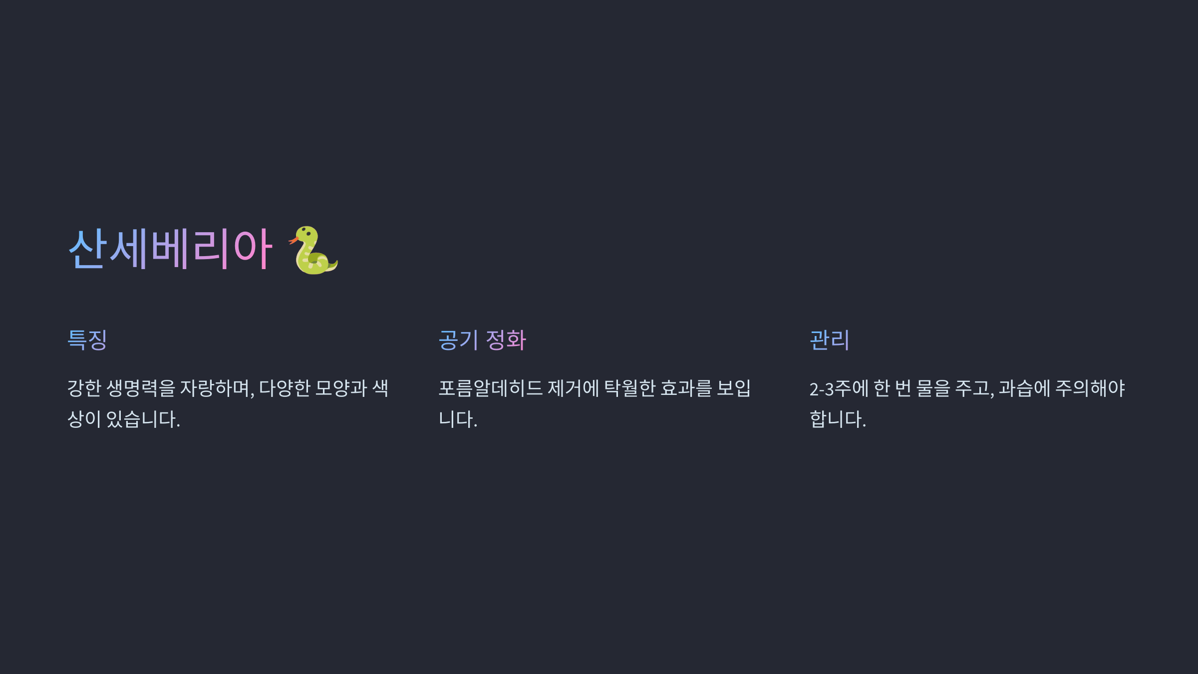 산세베리아는 NASA에서 공기 정화 식물로 선정한 만큼, 실내 공기 정화 능력이 뛰어난 식물이랍니다. 이 식물은 밤에도 산소를 배출해 숙면을 도와줘요! 🌿
