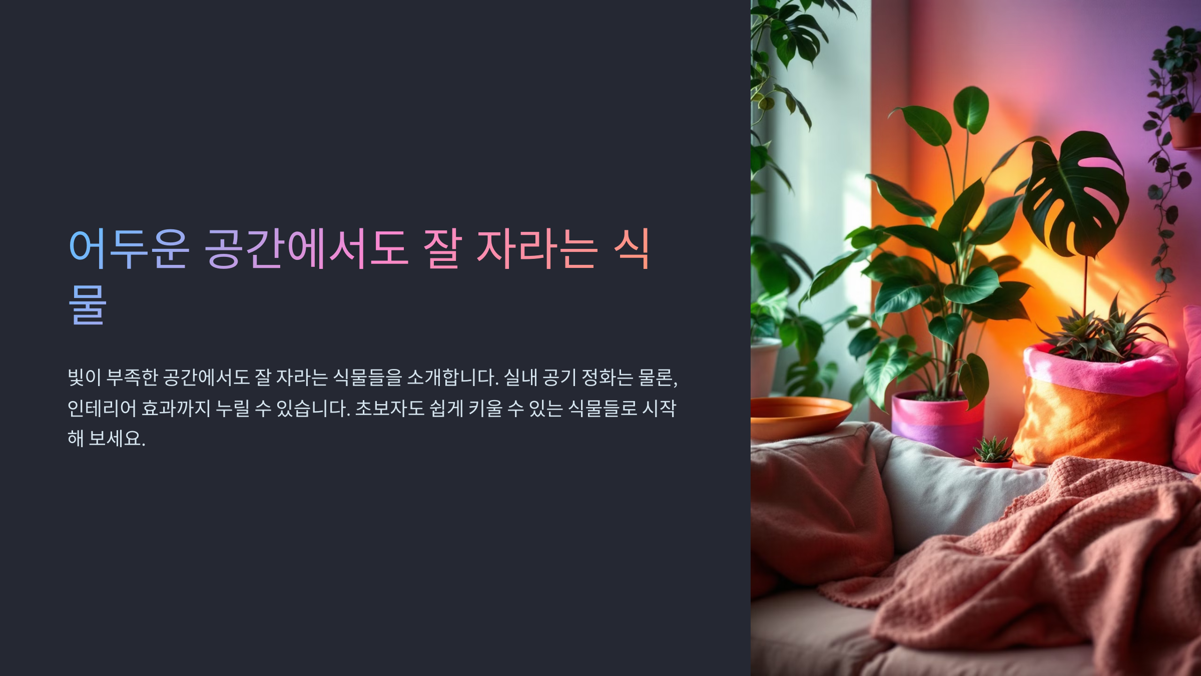 집 안 곳곳을 싱그럽게 꾸미고 싶지만 햇빛이 부족해서 고민이신가요? 걱정하지 마세요! 어두운 공간에서도 잘 자라는 식물이 많답니다. 🌿