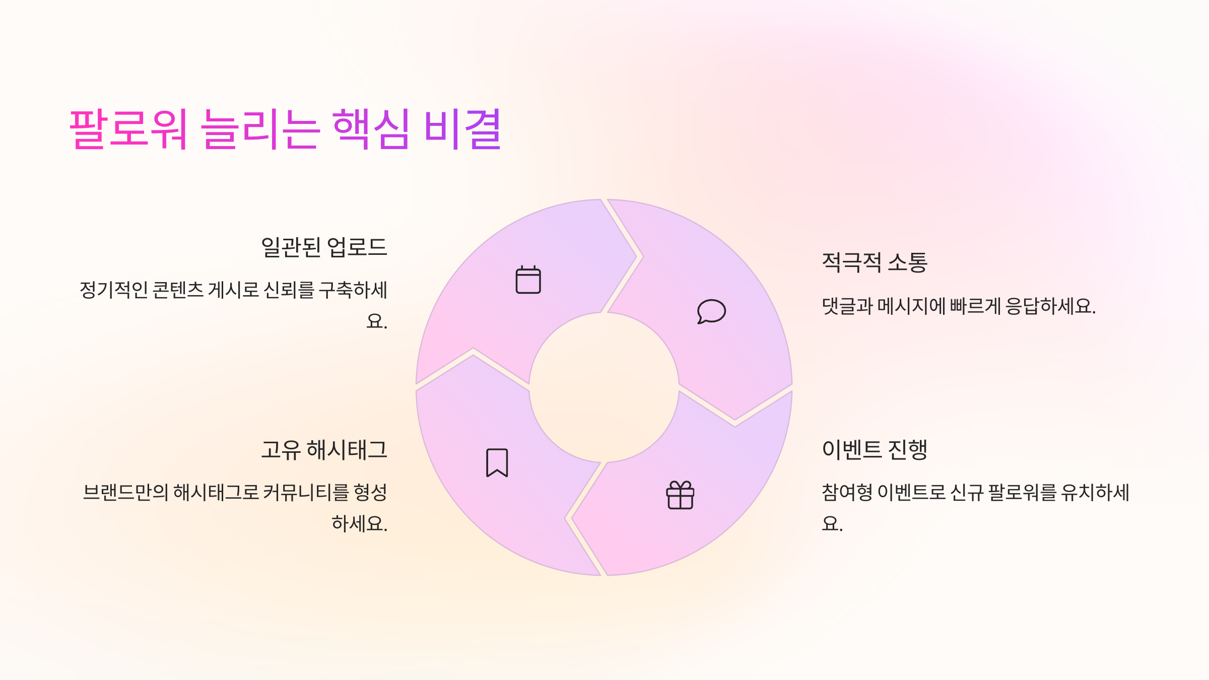 팔로워 늘리는 핵심 비결 팔로워를 늘리려면 ‘나를 팔로우해야 하는 이유’를 명확하게 보여줘야 해요. 단순히 예쁜 피드보단, 실용성과 공감, 꿀팁이 담긴 콘텐츠가 훨씬 효과적이에요! 💡