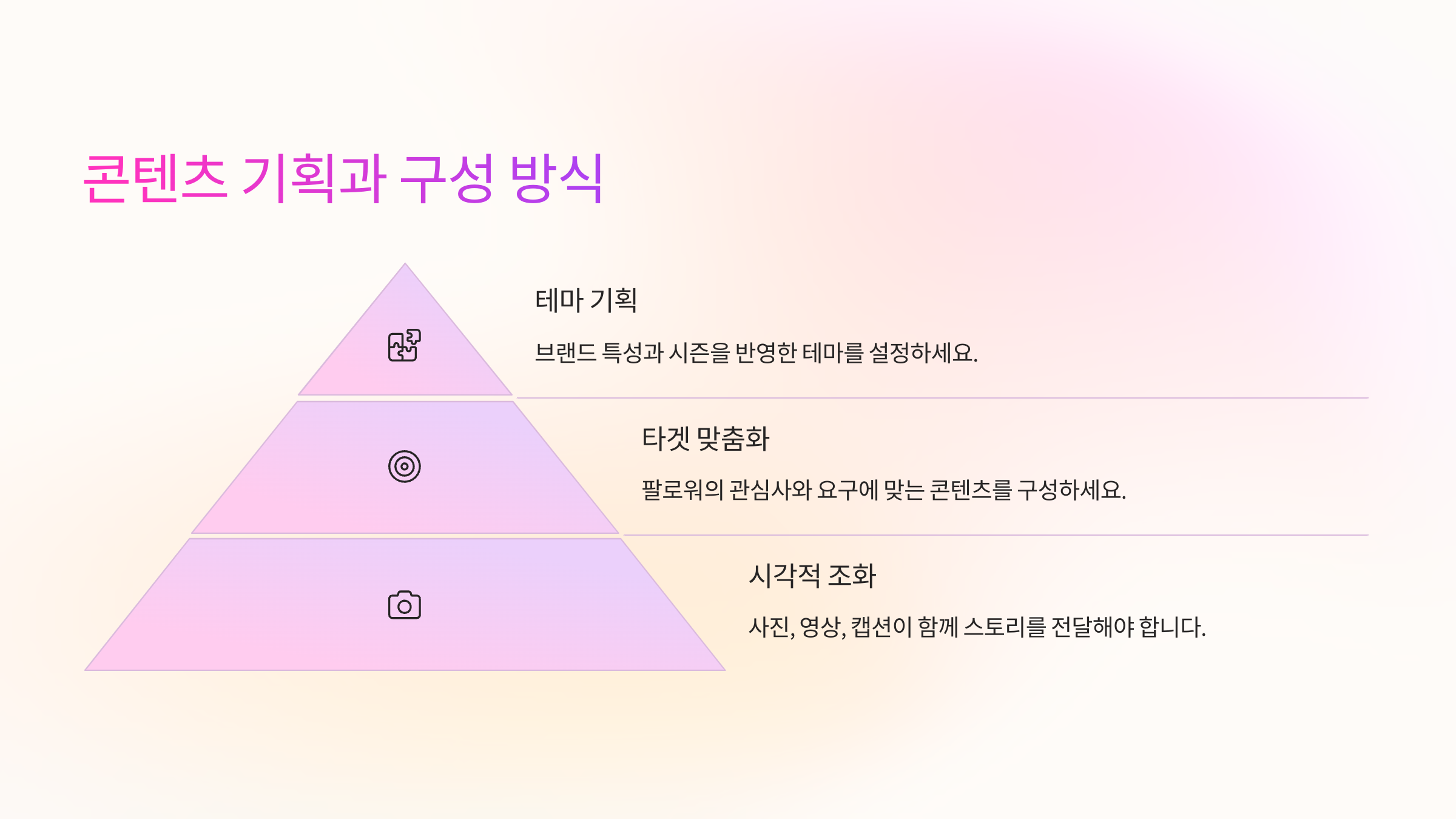 콘텐츠는 팔로워를 만드는 핵심이자, 판매나 수익의 시작점이에요. 단순한 사진 올리기보단, ‘정보+감성+실용성’을 결합한 콘텐츠가 효과가 좋아요! 📋📸🖊 기획 팁 - 3줄 규칙: 첫 문장 = 훅, 중간 = 정보, 마지막 = 감정/질문 - 텍스트+이미지: 카드뉴스/캡션 스타일로 정보 전달 - 콘텐츠 유형: 브이로그형, 인포그래픽형, 챌린지형, 전후비교형 - CTA 유도: 댓글, 저장, 공유 요청 문장 꼭 포함
