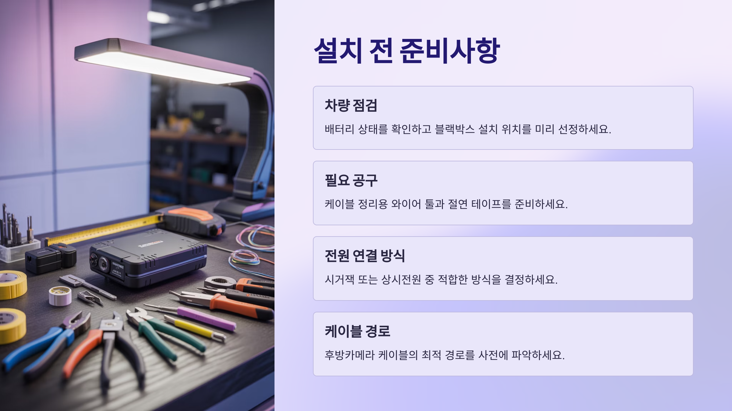 설치 도구들도 준비하면 좋아요. 일자 드라이버, 선정리 도구, 절연 테이프, 니퍼 등이 있으면 작업이 훨씬 수월해진답니다. 특히 선정리 도구는 A필러 속 배선을 숨길 때 유용해요.
