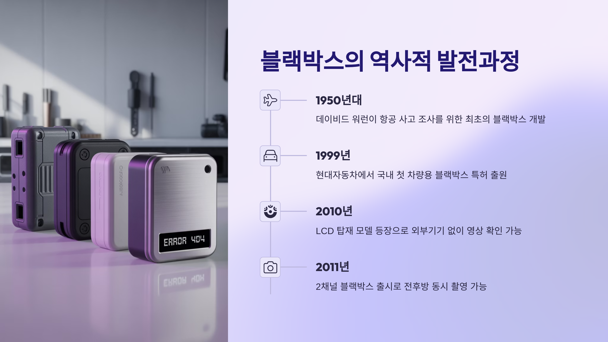 블랙박스는 원래 항공기 사고 조사용 장비로 시작되었어요. 하지만 자동차 분야에서는 2000년대 중반부터 점차 상용화되기 시작했고, 초창기 제품은 단순히 전방만 녹화하던 형태였답니다.국내에서는 2009년쯤부터 자동차 블랙박스가 본격적으로 보급되기 시작했어요. 특히 교통사고 시 영상 증거가 결정적인 역할을 하면서 수요가 급증했죠. 그 결과 다양한 제조사들이 경쟁적으로 기술 개발에 나섰고, 블랙박스의 기능도 크게 향상되었답니다.