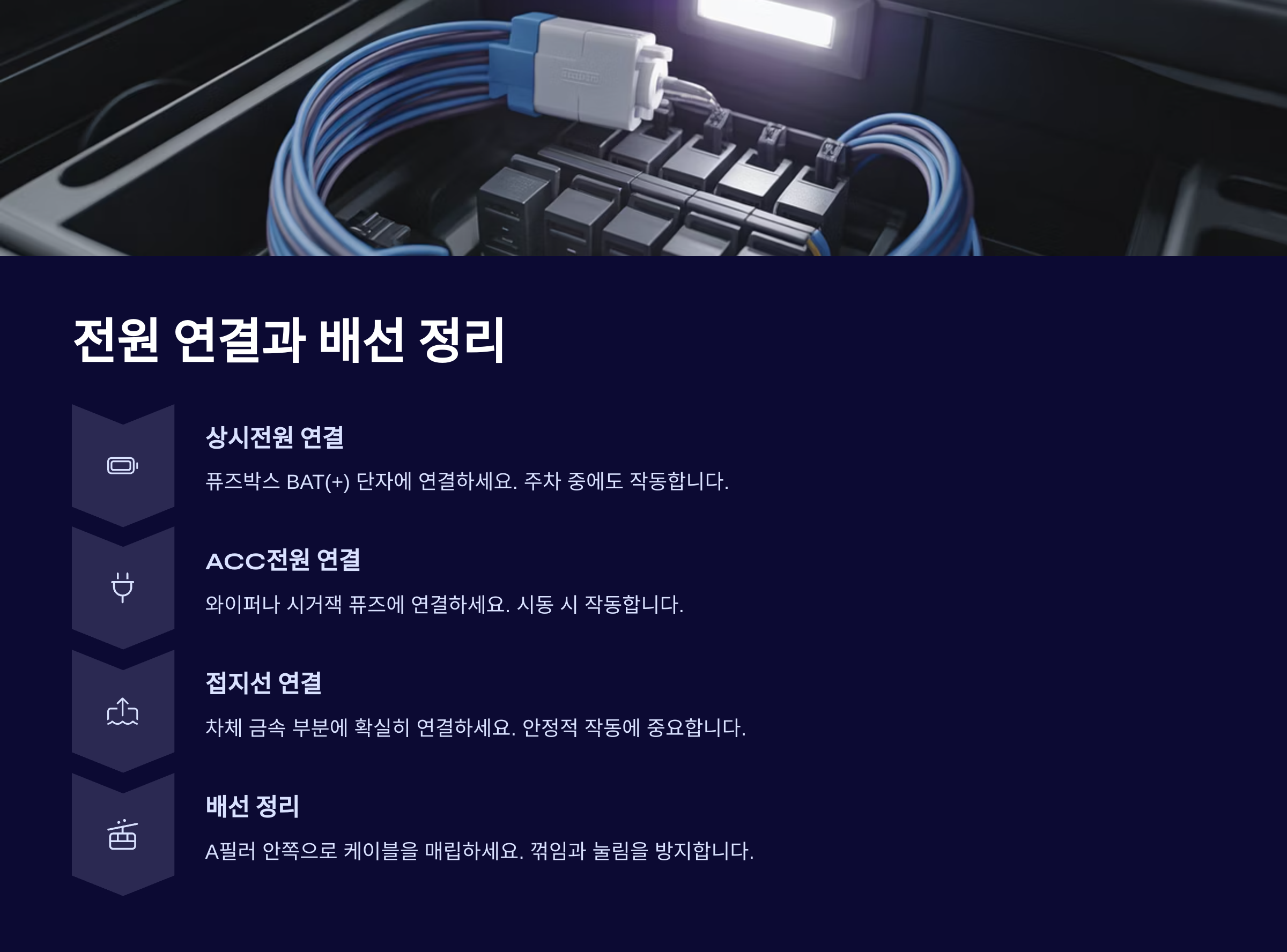 배선을 정리할 때는 차량 운전석 하단이나 글러브박스 쪽으로 정리하면 깔끔하게 마무리돼요. 특히 고온에 노출되는 부위는 피하고, 배선이 움직이지 않게 클립이나 테이프로 단단히 고정해야 해요. 선이 느슨하면 주행 중 잡음이 발생하거나, 고장이 날 수 있어요. 🎯