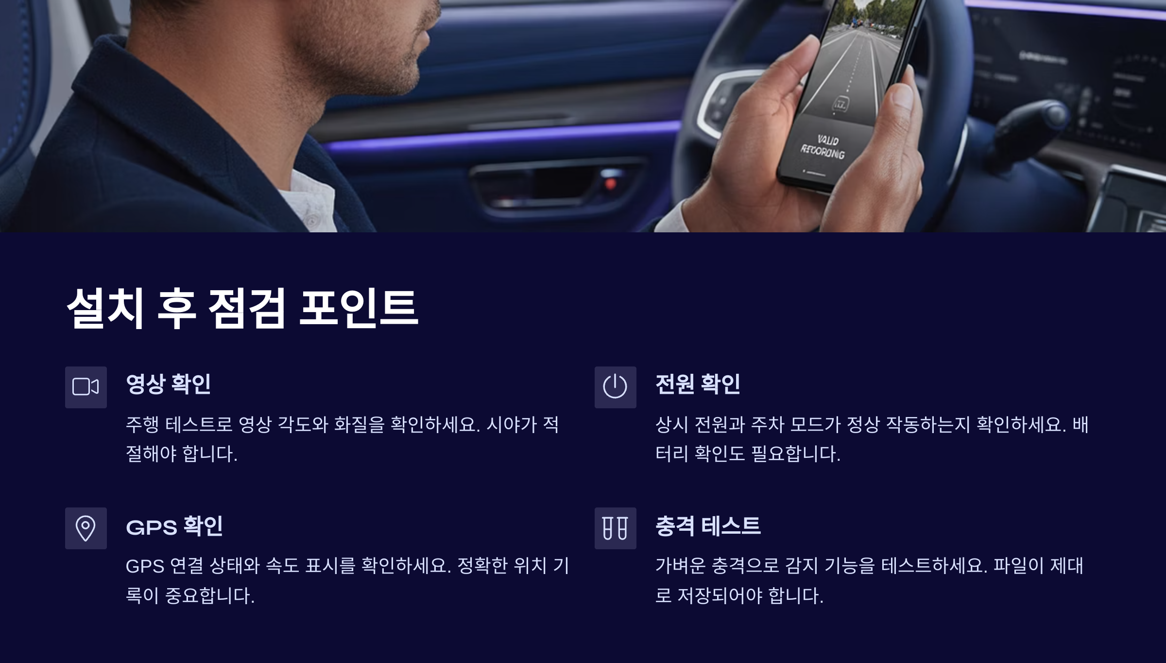 이제 블랙박스 설치가 끝났다면, 마지막으로 꼭 확인해야 할 점검 포인트가 있어요. 많은 분들이 설치 후 테스트 없이 그냥 사용하는 경우가 있는데, 이런 경우 중요한 순간에 녹화가 안 되는 문제가 생길 수 있어요. 반드시 테스트 운행과 점검이 필요해요.먼저, 블랙박스가 정상적으로 작동하는지 확인해요. 전원을 켜고, 화면에 날짜·시간·녹화 표시가 뜨는지 확인해야 해요. SD카드가 인식되지 않거나 포맷 오류 메시지가 뜨는 경우엔 다시 포맷을 하거나 카드를 교체해 보는 것도 방법이에요.