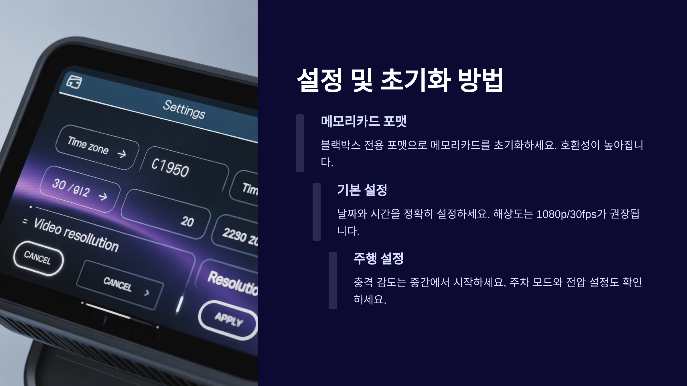 설정 및 초기화 방법 블랙박스를 설치하고 나면 가장 먼저 해야 할 일은 초기 설정이에요. 많은 분들이 이 부분을 건너뛰는데, 녹화 품질이나 저장 방식, 주차 모드 설정 등은 나중에 후회하지 않기 위해 꼭 체크해야 해요. 대부분의 블랙박스는 본체 화면이나 스마트폰 앱을 통해 설정할 수 있어요.