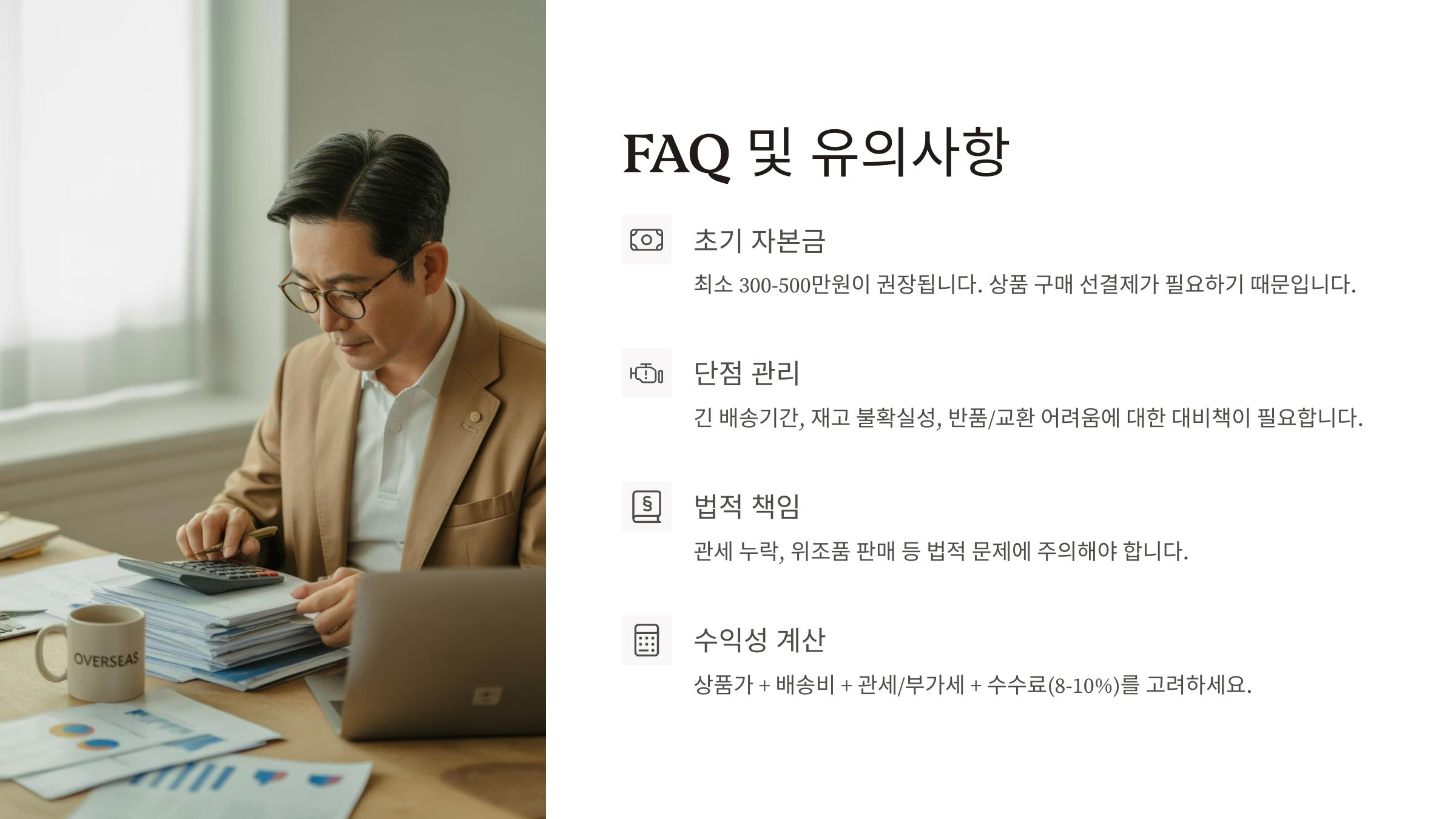 내가 생각했을 때 해외구매대행은 ‘해외 쇼핑을 대신해주는 전문가 서비스’예요. 판매자가 아니라 '구매대행자'로 수수료를 받는 구조라 리스크가 적고 유연하게 운영할 수 있어요! 💼