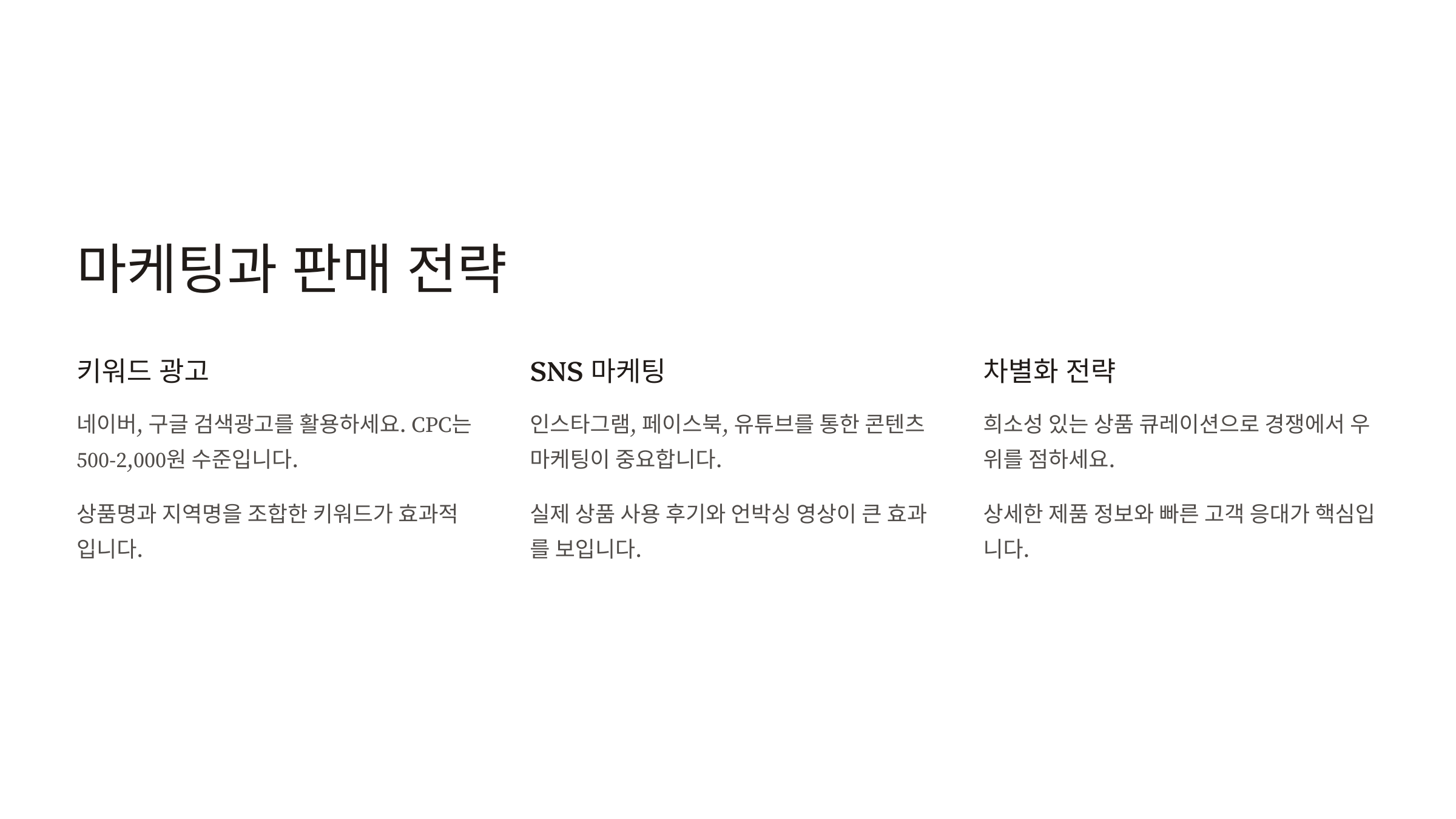 마케팅과 판매 전략 해외구매대행은 제품 자체가 생소한 경우가 많기 때문에, 상세 설명과 사진, 리뷰가 구매 전환에 매우 큰 영향을 줘요.