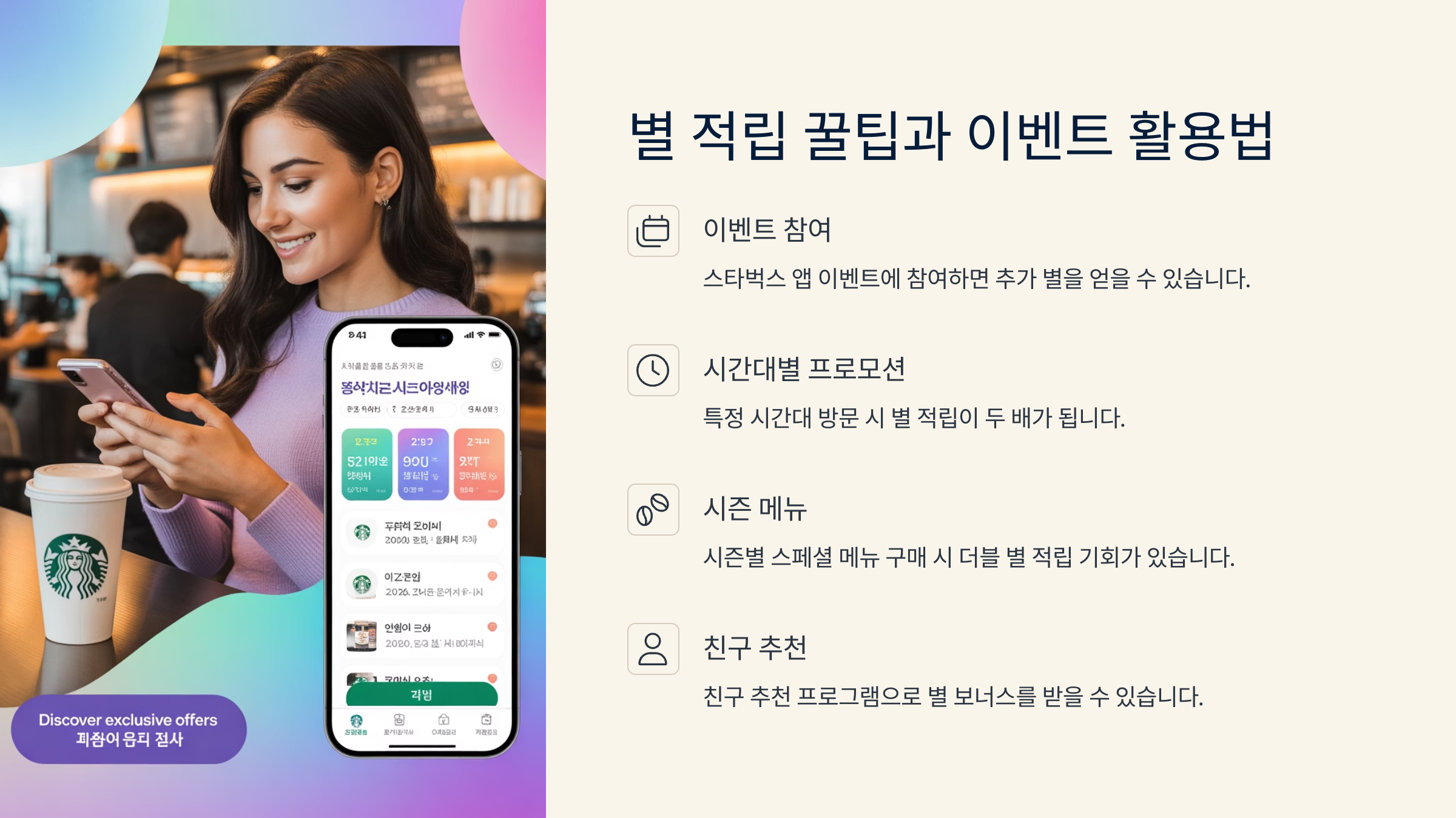 별을 일정 개수 이상 모으면 무료 음료 쿠폰이 생기고, 골드 등급이 되면 생일 쿠폰, 이벤트 우선 초대, 전용 음료 등 여러 가지 특전도 누릴 수 있어요 🎁