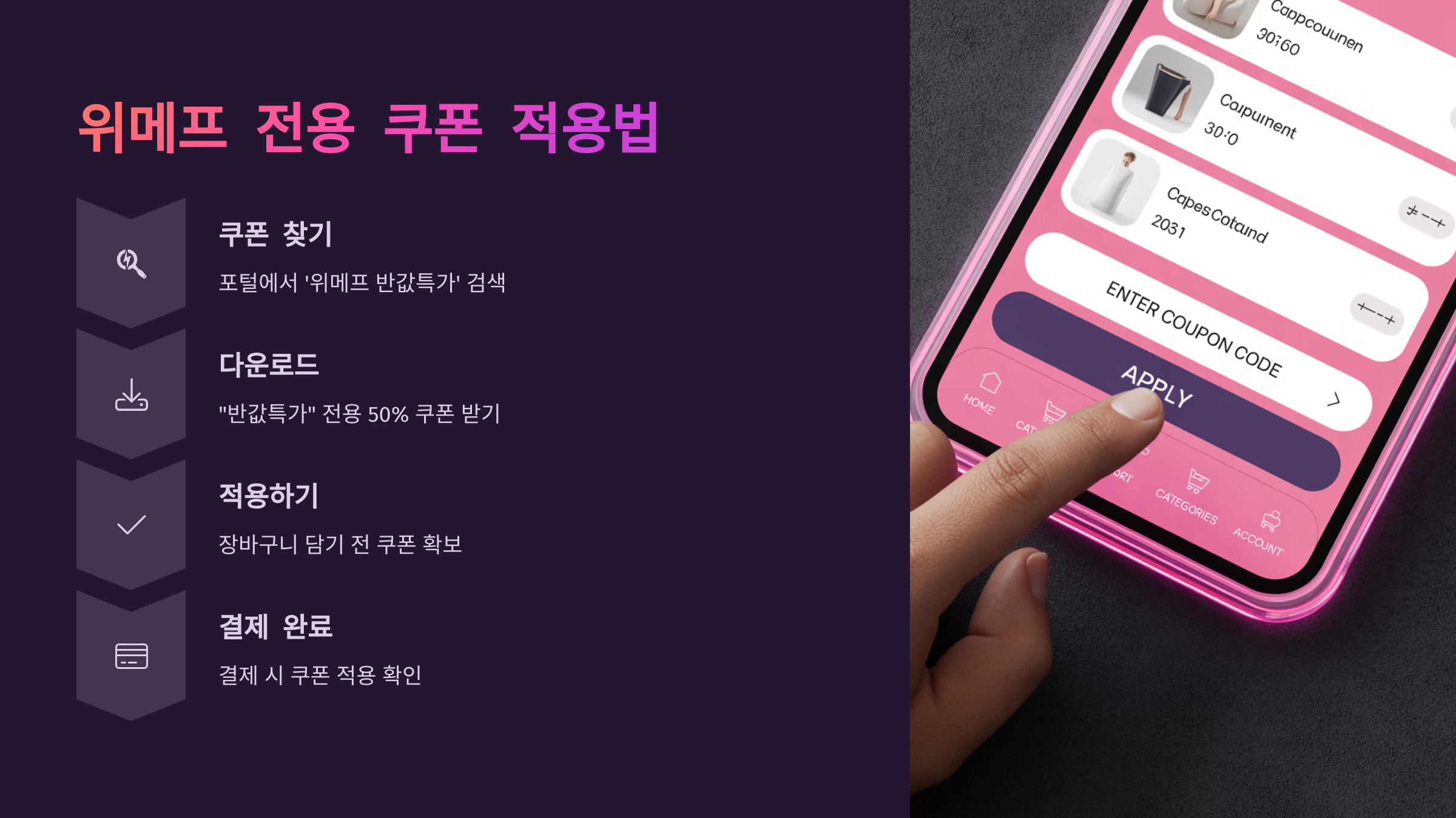 요일 자주 등장 카테고리 특징 월요일 식품, 간편식 주초 리필용 식자재 특가 수요일 가전, 소형기기 기획전 연동 많은 날 금요일 패션, 뷰티 주말 대비 인기 브랜드 등장 🎟️ 위메프 전용 쿠폰 적용법