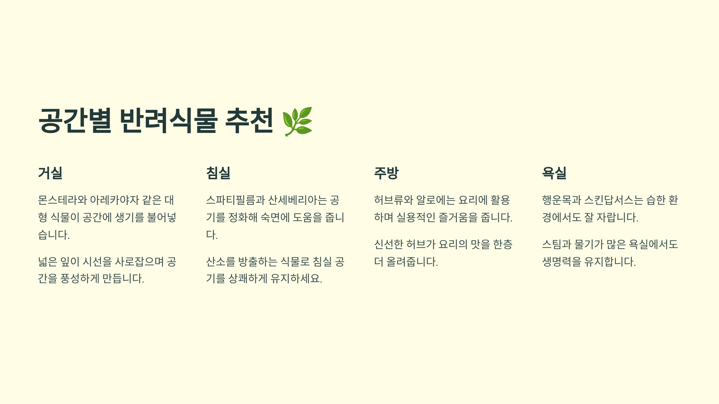 식물은 단순한 녹색 오브제가 아니라, 우리 삶의 품질을 높여주는 친구예요. 다음 섹션에서는 공간별로 어떤 반려식물이 잘 어울리는지 살펴볼게요 🪴