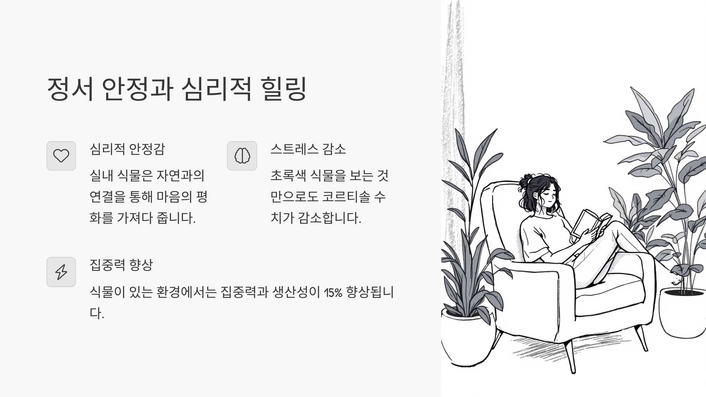 반려식물은 우리의 정서에 긍정적인 영향을 줘요. 스트레스를 많이 받는 현대인에게 초록 식물은 자연의 일부를 집 안에 들여놓는 느낌을 주거든요. 특히 초록색은 인간의 눈과 뇌에 안정감을 준다고 해요. 덕분에 식물을 가까이 두면 감정 기복이 줄고 집중력이 향상되는 효과가 나타나죠.