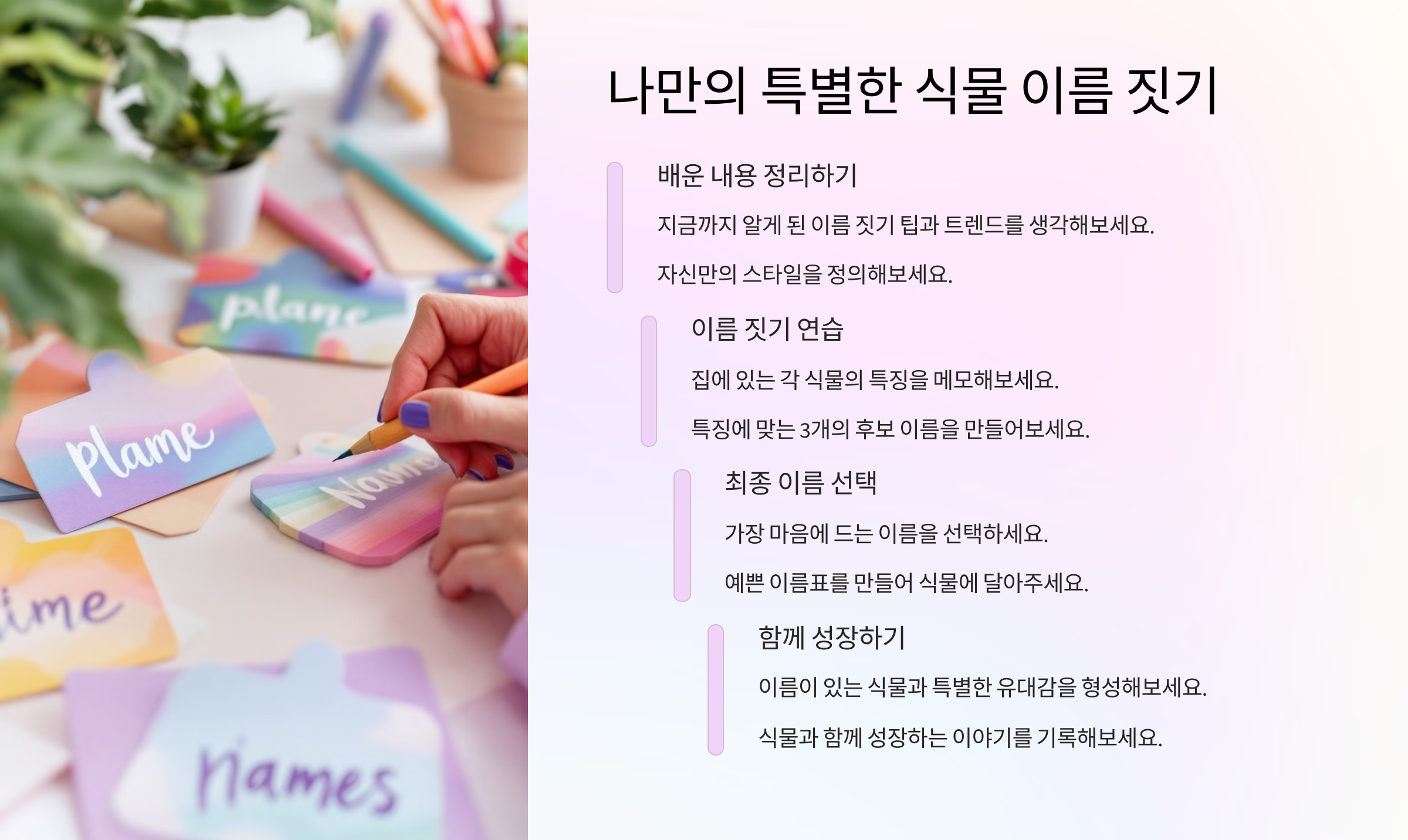 반려식물 이름 지을 때 가장 중요한 건, 그 식물만의 ‘느낌’을 담아내는 거예요. 이름은 식물의 모습, 색감, 성격, 혹은 키우는 사람의 취향에 따라 달라질 수 있어요. 너무 어렵게 생각하지 말고, 직관적으로 떠오르는 감정이나 단어를 떠올려보는 게 첫 단계예요 💡