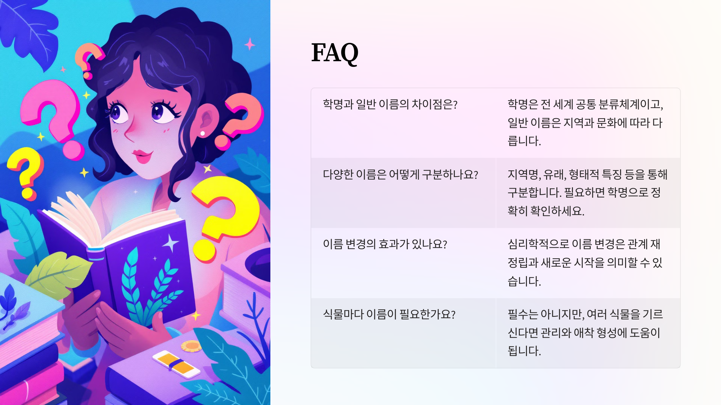 이 글에서는 ‘왜 식물에게 이름을 붙여야 하는지’, 또 ‘어떻게 센스있게 이름을 지을 수 있는지’를 재미있고 알차게 알려줄게요! 지금부터 네 반려식물의 이름 센스를 한 단계 업그레이드해보자구요🌼