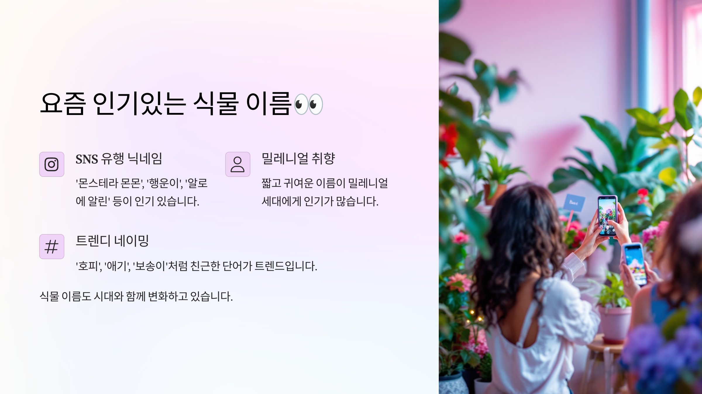 트렌디한 이름을 참고하되, 나만의 감성을 담아 재해석해보는 것도 좋아요. 식물의 생김새와 성격, 그리고 함께하고 싶은 마음까지 담아보세요 🌼
