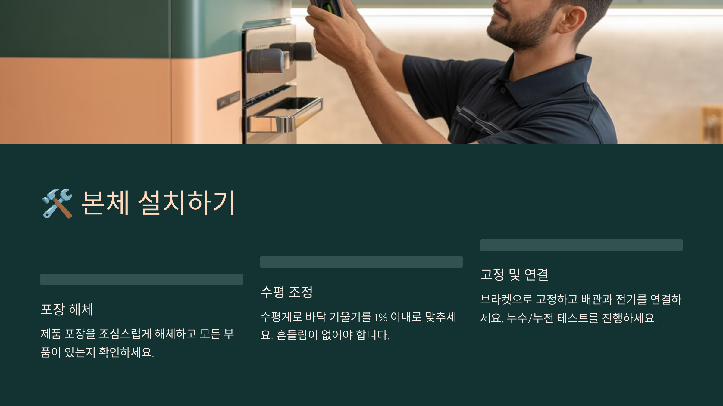 A1. 보통 셀프 설치는 1~2시간 정도면 충분하지만, 배관이 복잡하거나 빌트인 제품은 3시간 이상 걸릴 수 있어요.