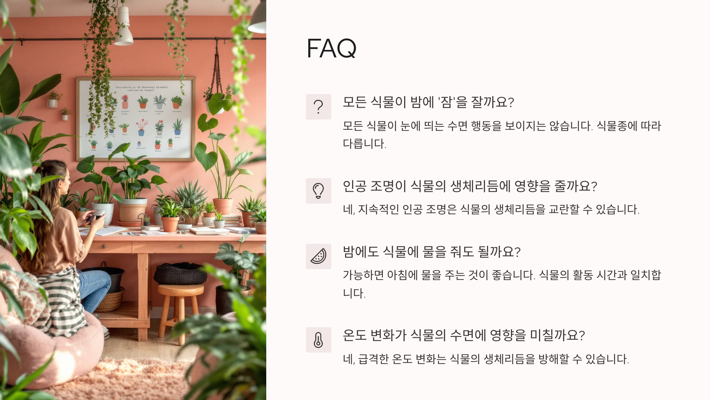 이제 식물의 수면, 생체리듬, 감정적 교감까지 충분히 알아봤으니, 마지막으로 많은 분들이 궁금해할 내용을 모은 FAQ 섹션으로 넘어가볼게요! 📌