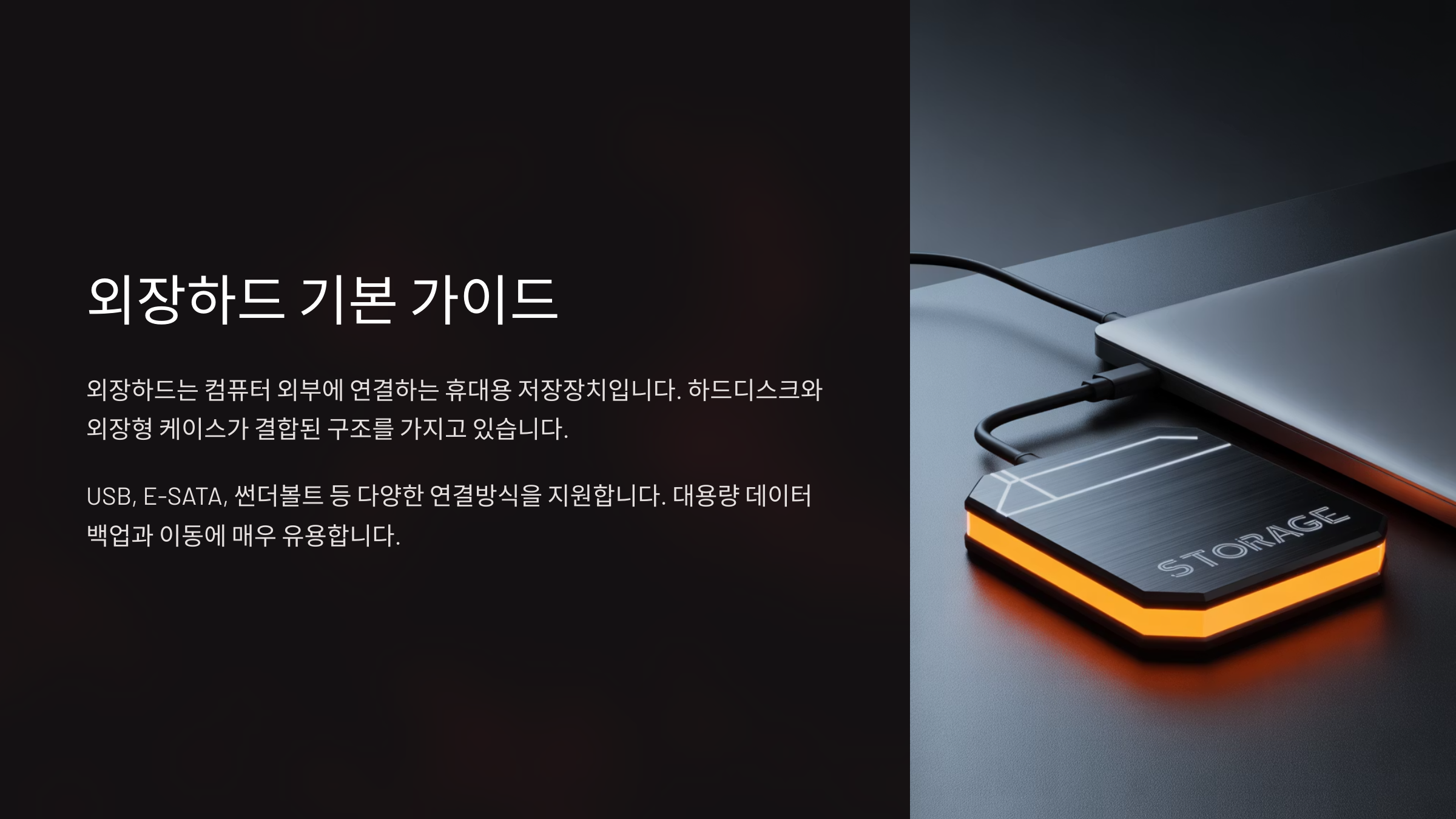 외장하드는 컴퓨터나 노트북, 콘솔 등에 연결해 데이터를 저장하거나 백업할 수 있는 장치예요. 보통 USB나 썬더볼트 포트를 통해 연결하고, 내부에는 일반 하드디스크(HDD)나 SSD가 들어 있어요.