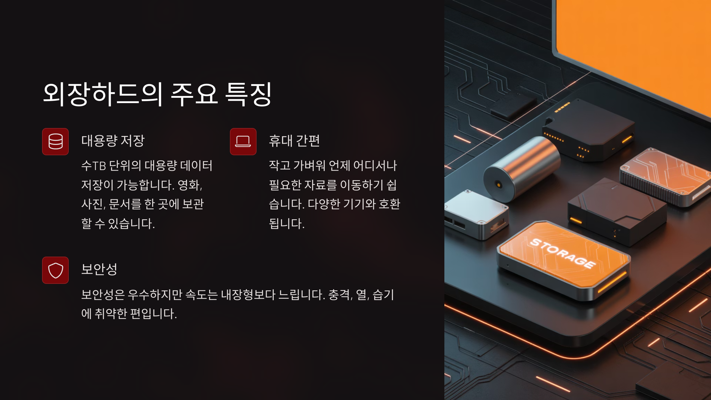 | HDD 외장하드 | 회전 디스크 | 보통 | 중간 | 약함 |